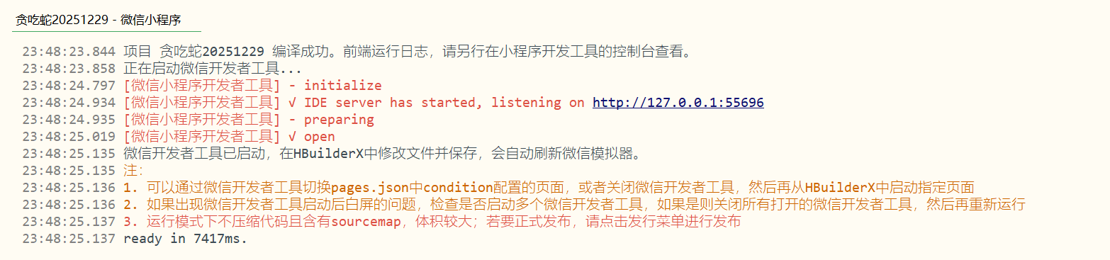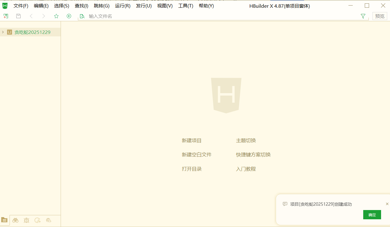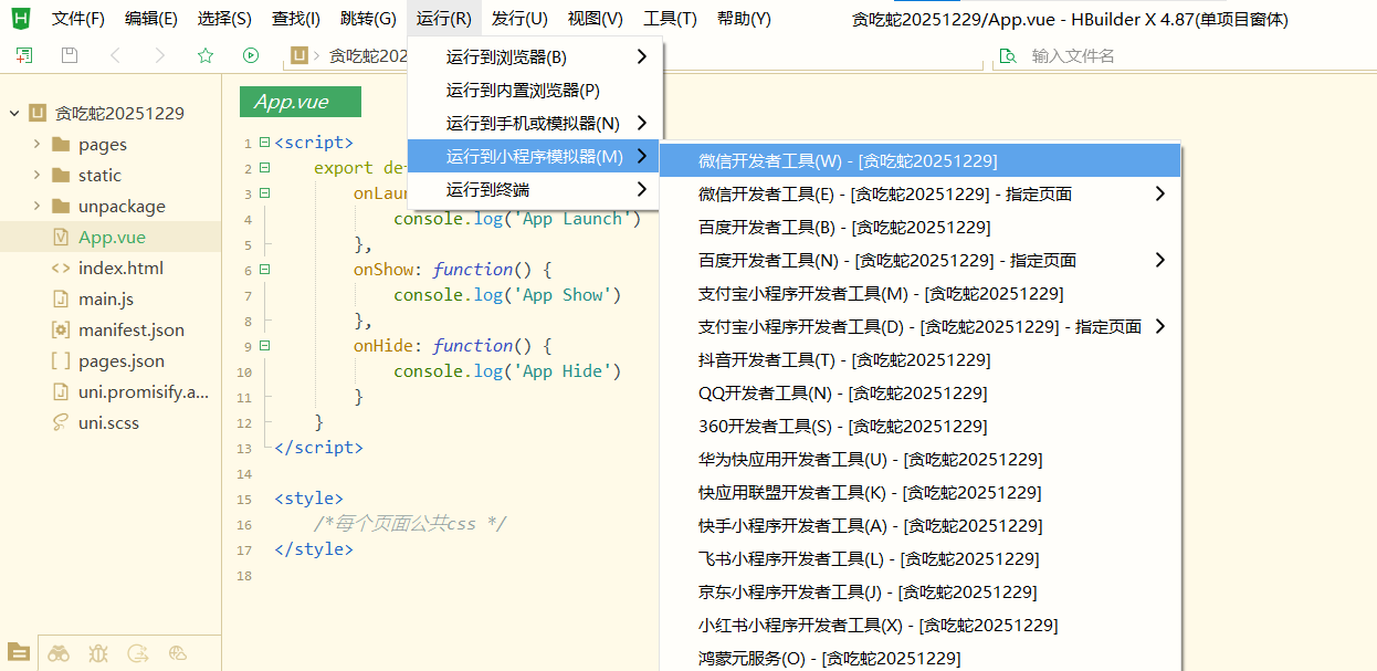 - 打开 HBuilderX,载入你的贪吃蛇项目。