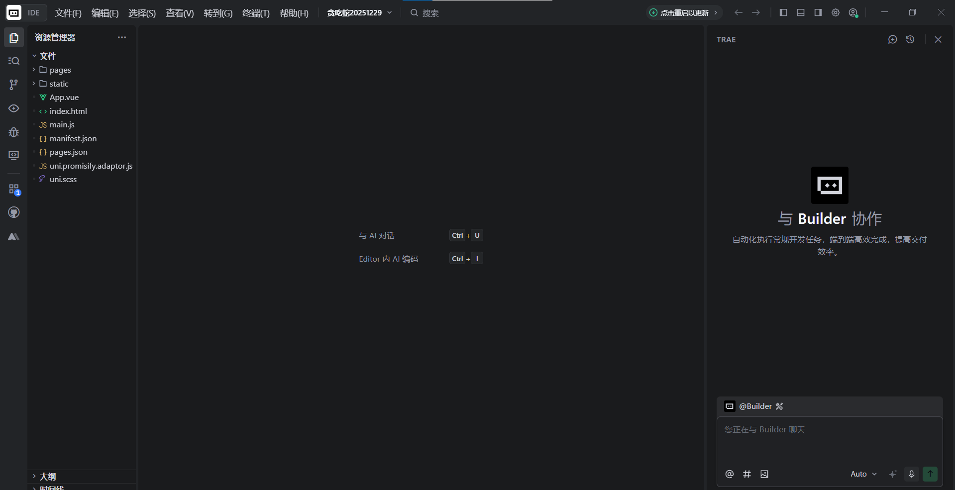 打开 Trae,载入前面已经准备好的小程序项目之后,我先没有急着改某一行代码,而是对内置的 AI 助手说了这样一件事: