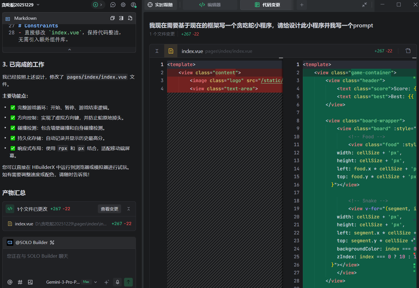- 接下来进入正式开发:在 Trae 中打开这个项目,用 vibecoding 的方式和 AI 对话,一步步生成首页和游戏页的布局,实现蛇移动、吃食物、游戏结束等核心玩法。