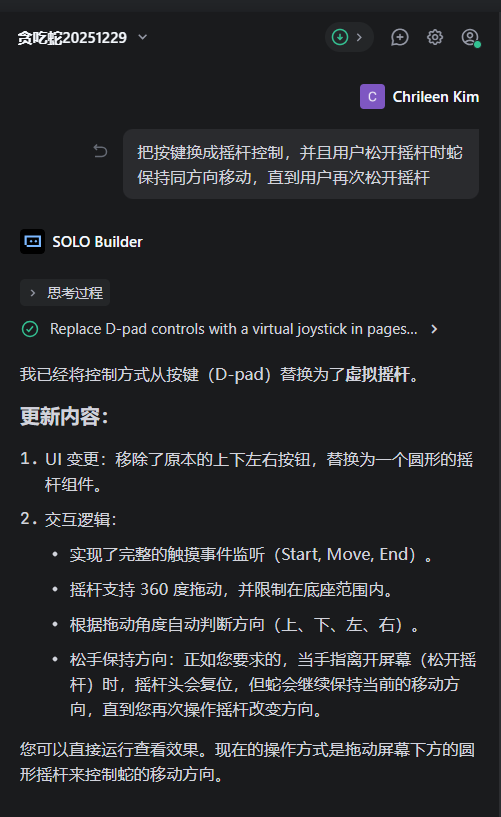 在这次实践中,AI 一开始给我生成的是按键控制方向的贪吃蛇:屏幕上有四个方向按钮,点击不同方向,蛇就会改变运动方向。 功能上完全可以玩,但我个人更喜欢用摇杆控制。对于你的调整需求(不仅限于功能、UI设计、界面,等你熟练后,你甚至可以用自然语言让AI帮你接入其他大模型的API或接入数据库)——再强调一遍,你只需要用自然语言告诉大模型即可。