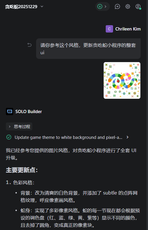 - 它会在对话区解释自己的思路,比如会在哪个目录下新增页面、打算如何组织游戏逻辑。