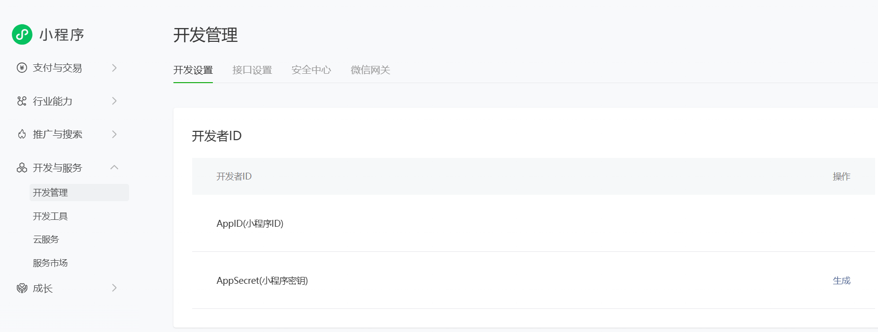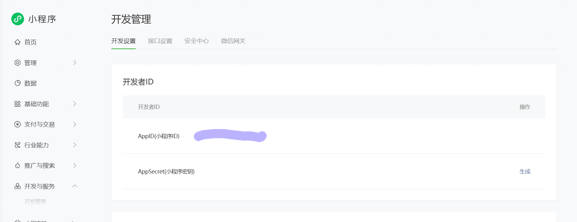 - 在页面上方,你会看到一块叫做「开发者 ID」的区域,里面有一行「AppID(小程序 ID)」——这就是你的小程序唯一编号。