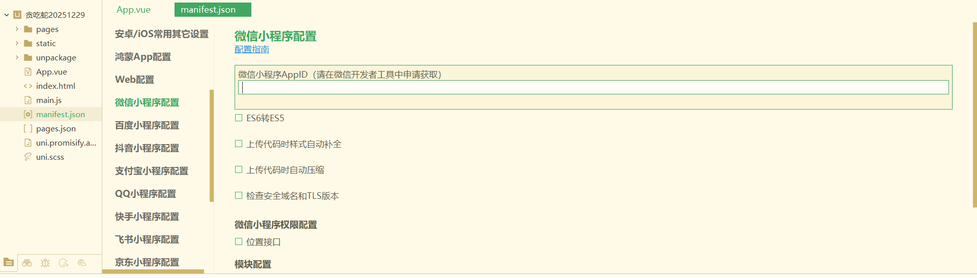 manifest.json,双击打开。 - 下拉到「微信小程序配置」这一栏,你会看到一个输入框,提示类似「微信小程序 AppID(请在微信开发者工具中获取)」。