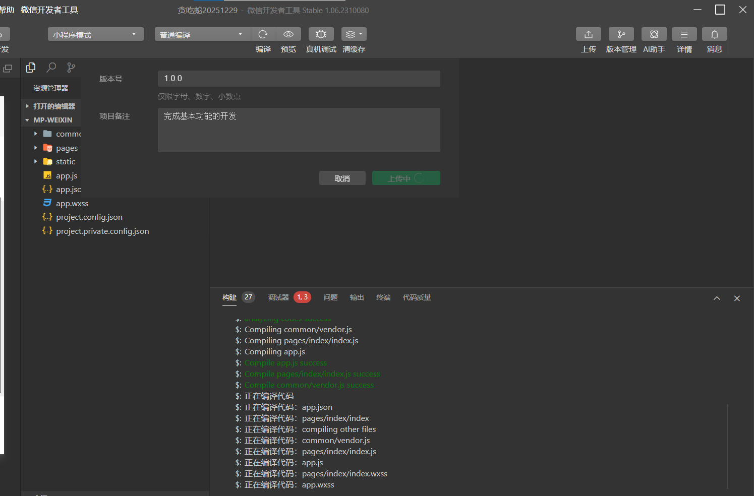 - 检查无误后,点击「上传」按钮。下面的输出区域会显示编译过程,所有步骤变成绿色并提示上传完成,就说明这一版已经成功提交到了微信服务器。