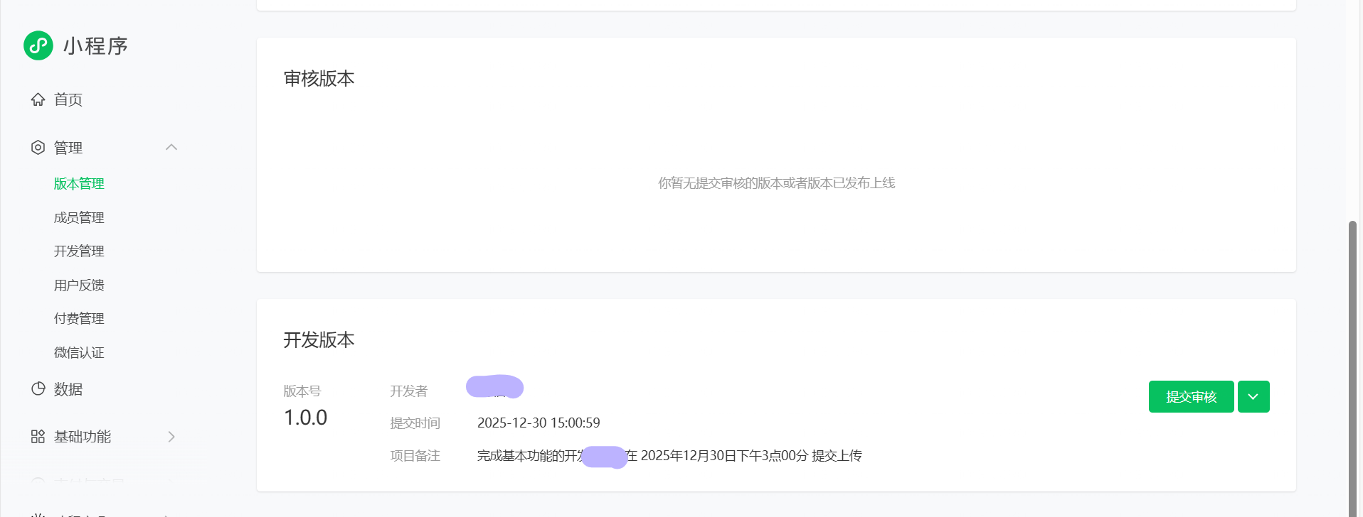 - 在「版本管理」中,你会看到这次提交的版本状态变为「审核中」。通过后,会变成「已发布」或可选择「上线」的状态。