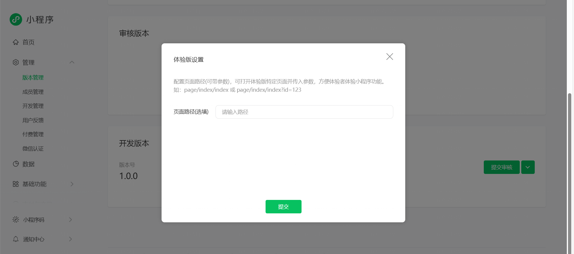 - 根据页面提示,点击「提交审核」或类似按钮,把当前开发版本送交微信团队审核。