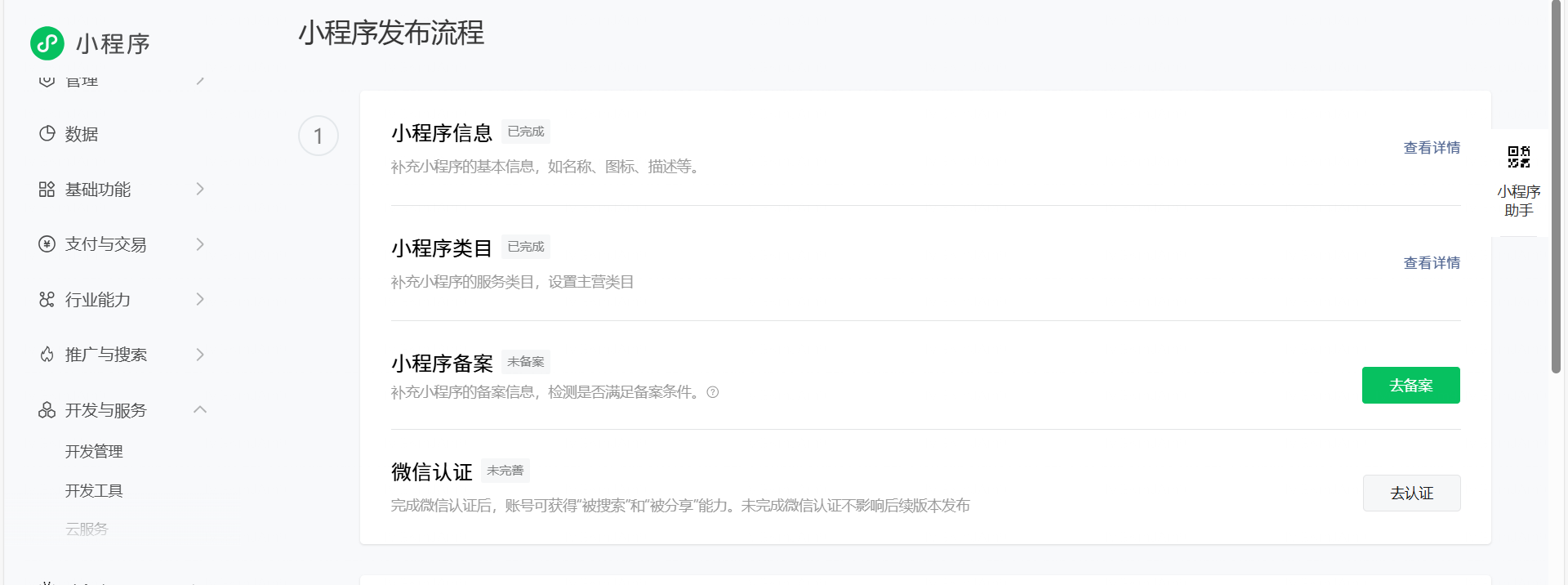 - 回到「小程序发布流程」总览页面,确认每一项都显示为已完成,进度条接近 100%。