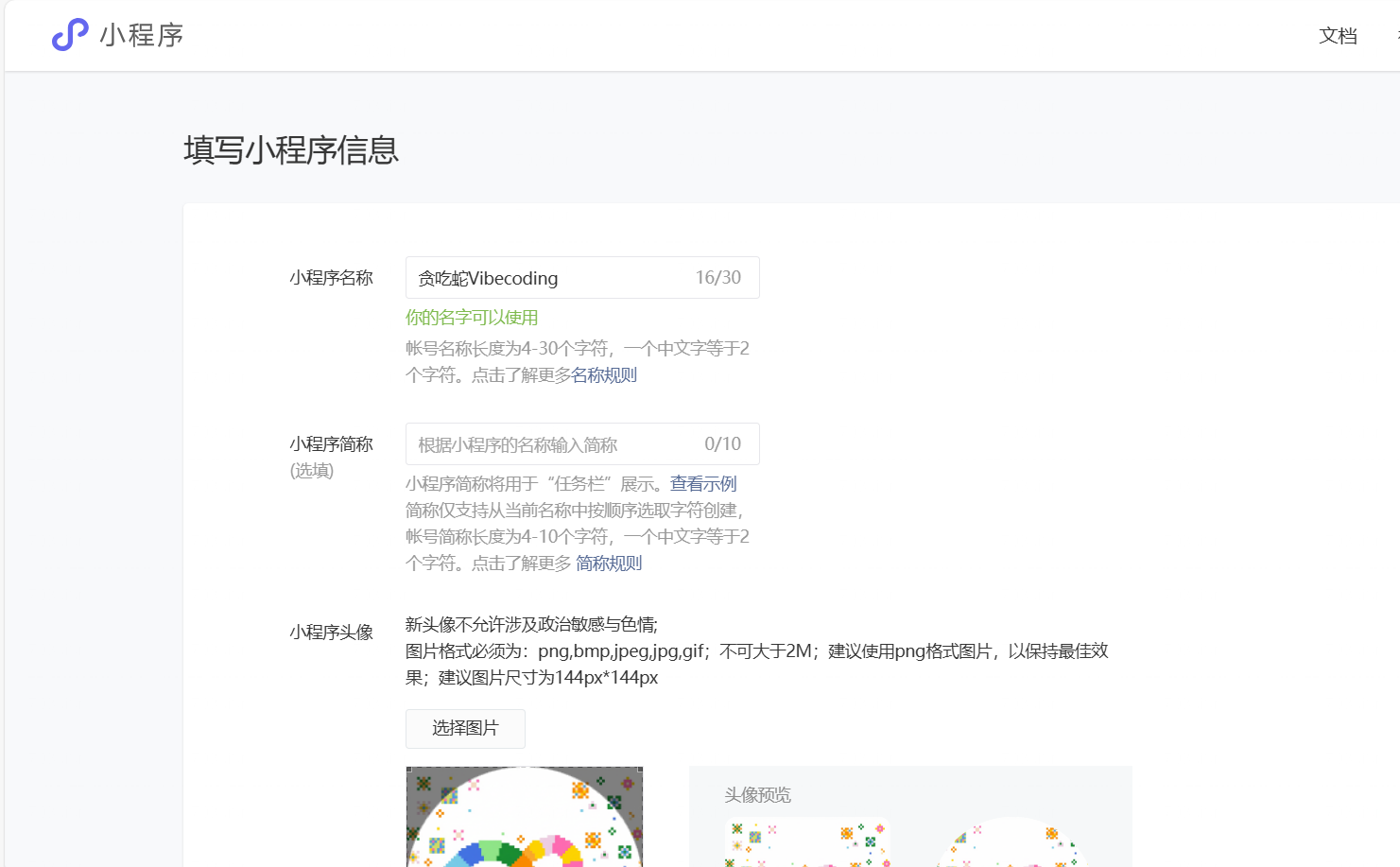 - 小程序名称 这个名字会出现在搜索结果和小程序顶部,有长度限制,同时需要符合微信的命名规范。建议选择既能表达功能,又方便记忆的名称,例如「贪吃蛇 vibecoding 版」这一类。