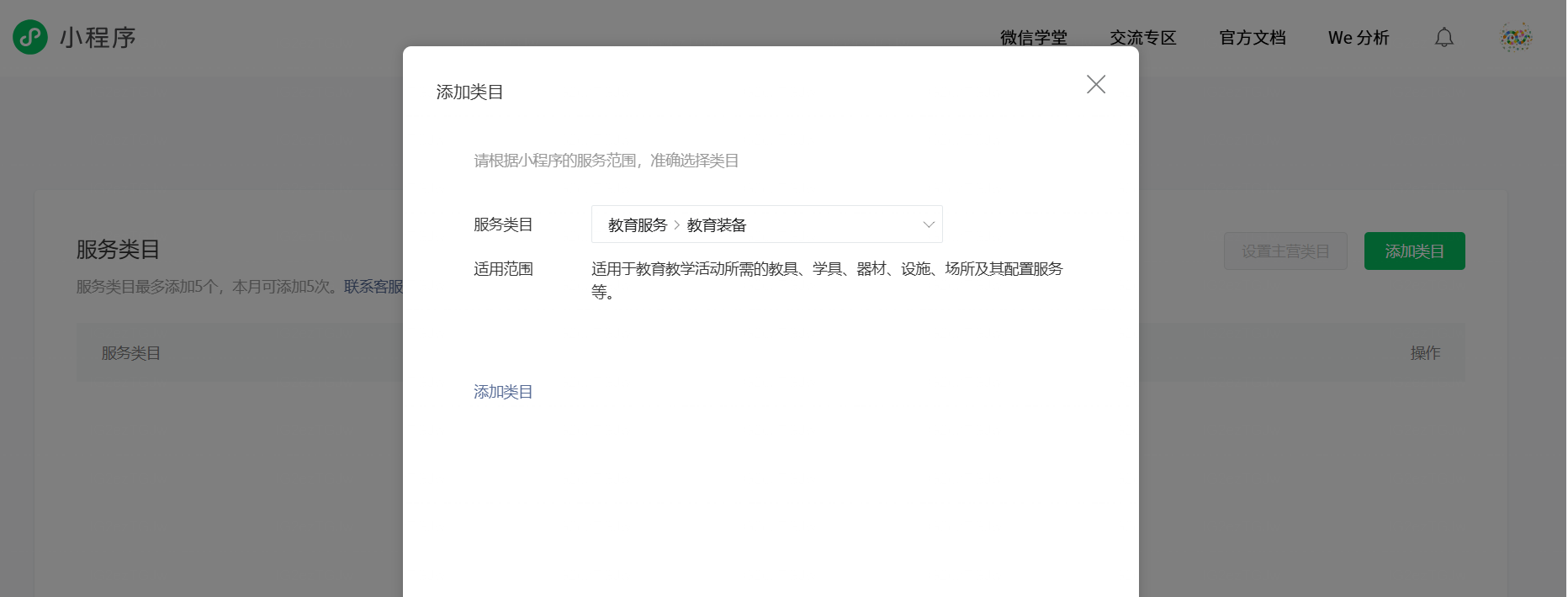 在这个页面,你会看到「添加类目」按钮。点击后,可以从系统提供的分类树中选择适合你小程序的方向,例如: