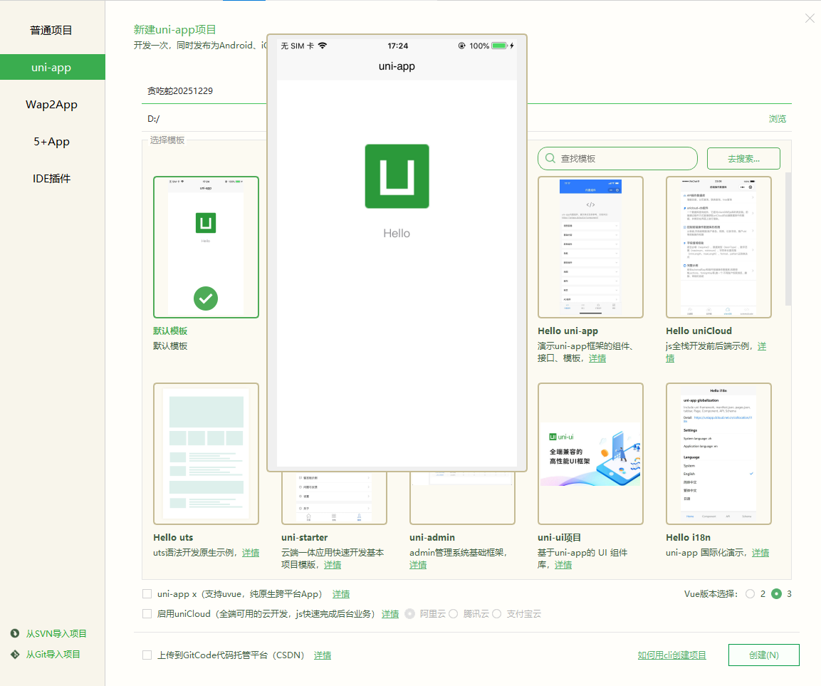 - 选择默认模板,给小程序起名,选择存放路径,带你及右下角的创建: