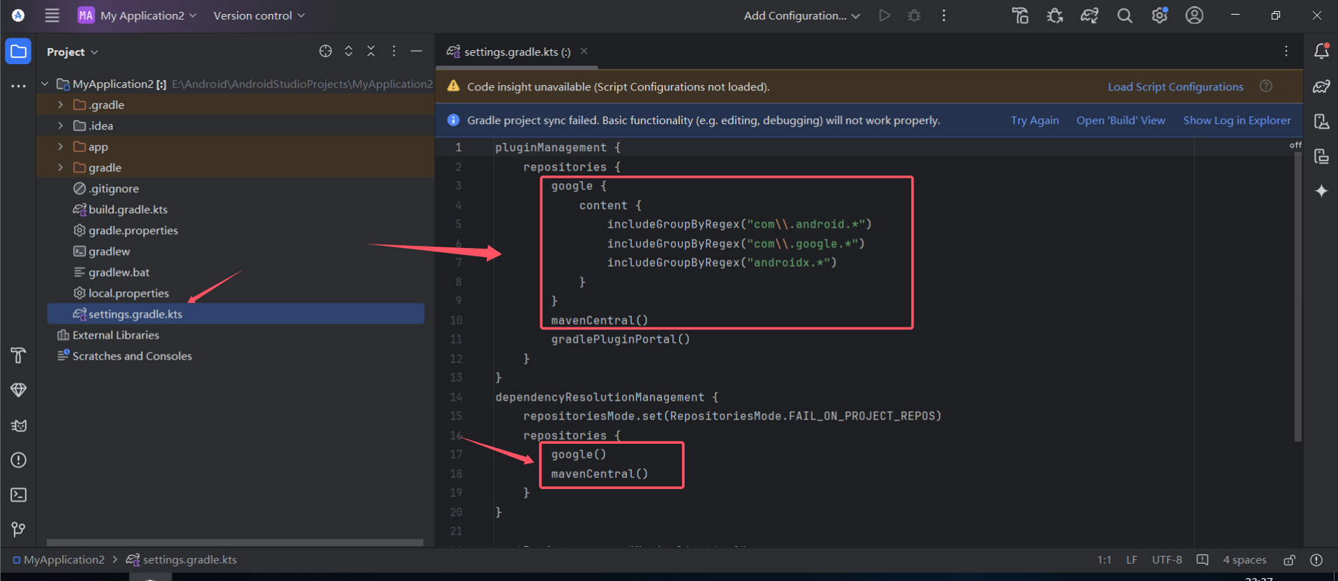 接着,在左侧目录的根节点下找到并打开 settings.gradle.kts 文件。,请将 repositories 大括号内的内容替换为以下代码: