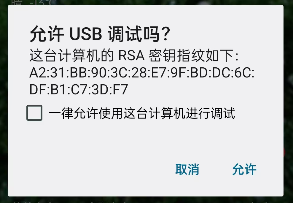 - 点击 ▶️ 运行,手机会弹出“允许 USB 调试吗?”对话框,勾选“始终允许”并点击确定。