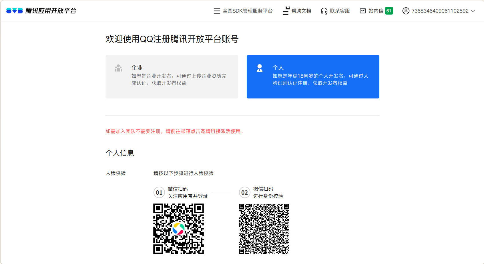 以腾讯应用宝为例: 访问腾讯开放平台,点击注册。建议使用 QQ 账号直接登录。注意,注册用的 QQ 号一旦绑定很难解绑,建议使用专门的工作 QQ。根据页面提示,选择“个人开发者”或“企业开发者”,上传身份证照片并进行人脸识别验证。认证通过后,点击【创建应用】即可开始。