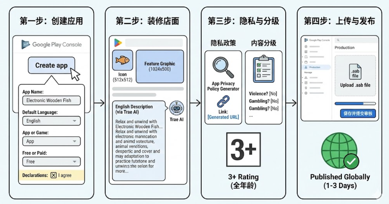 这是用户的“第一印象”。你需要上传之前准备好的 图标 (512x512) 和 置顶大图 (1024x500)。 至于英文介绍,直接让 Trae 帮忙:“请帮我写一段电子木鱼上架 Google Play 的英文介绍,语气轻松解压。” AI 写的通常比我们翻译的更地道。