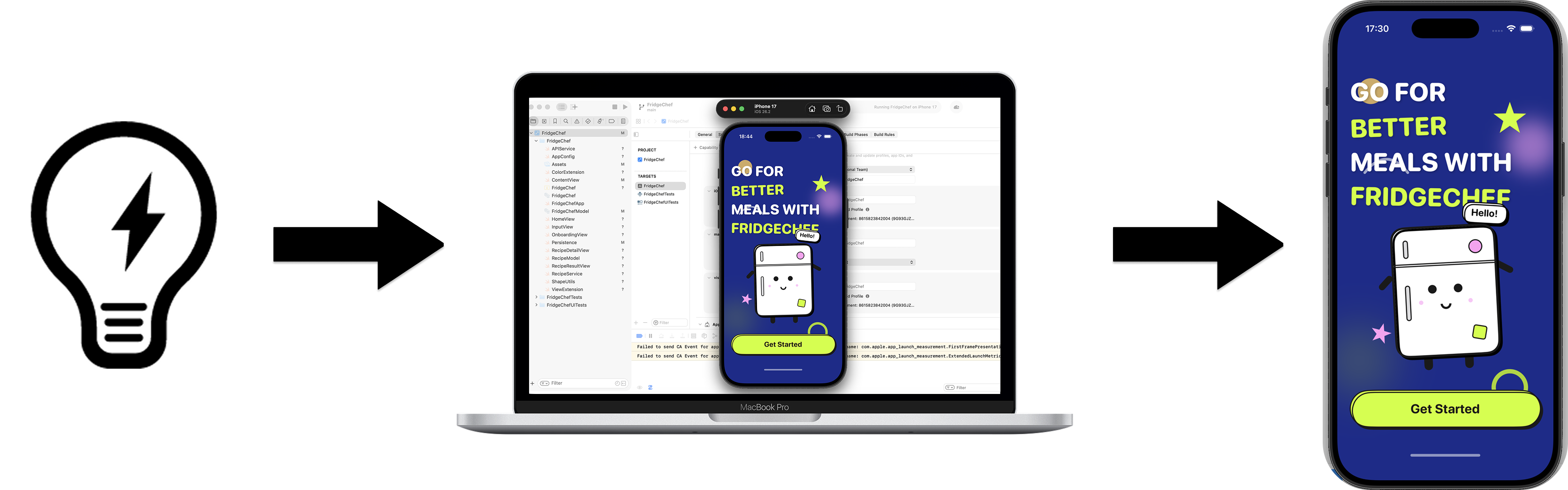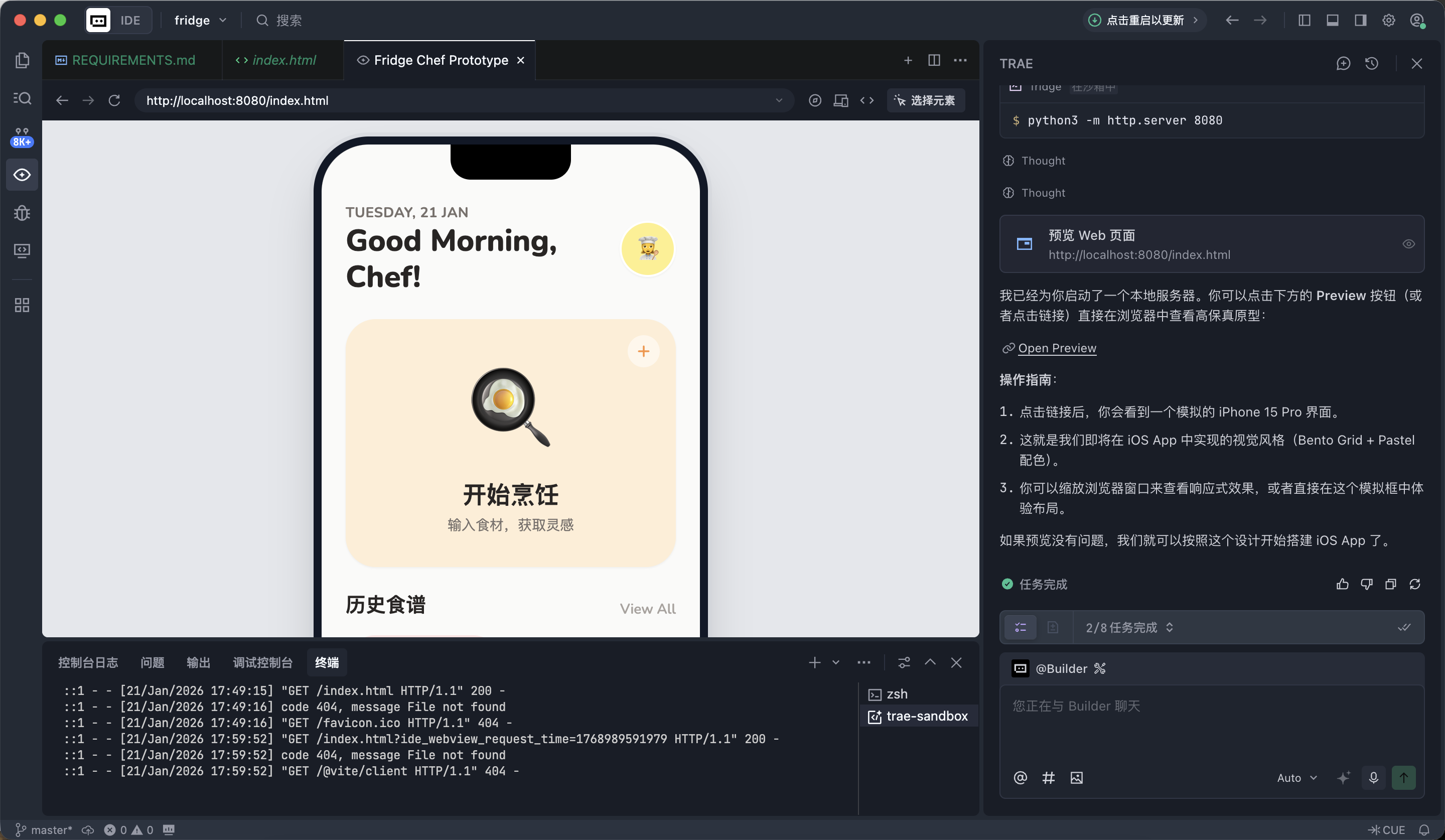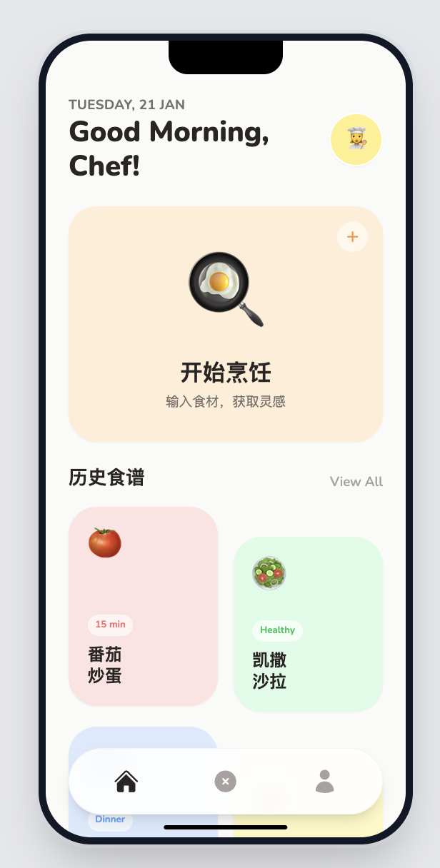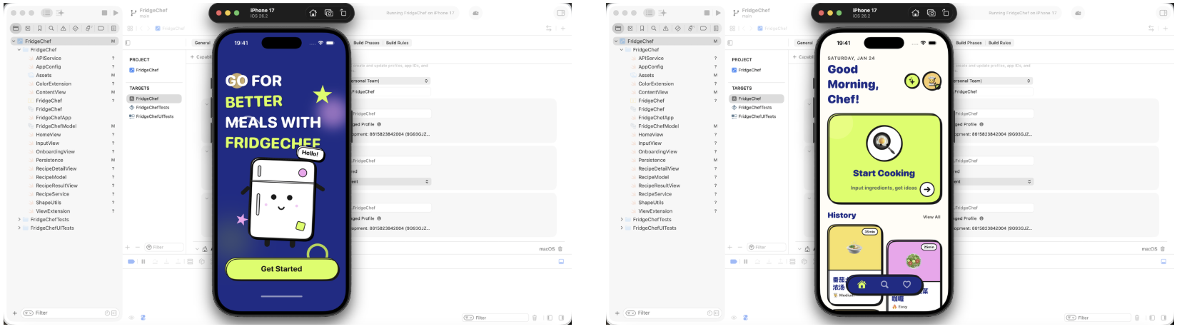 用户输入冰箱中现有的食材,应用会通过真实的 AI 接口生成一份可行的菜谱,并将结果保存到本地,方便后续查看。该示例完整覆盖了一个真实 iOS 应用所需的核心组成部分,包括界面输入与展示、网络请求、数据解析、本地存储,以及最终在真机上的安装与运行。