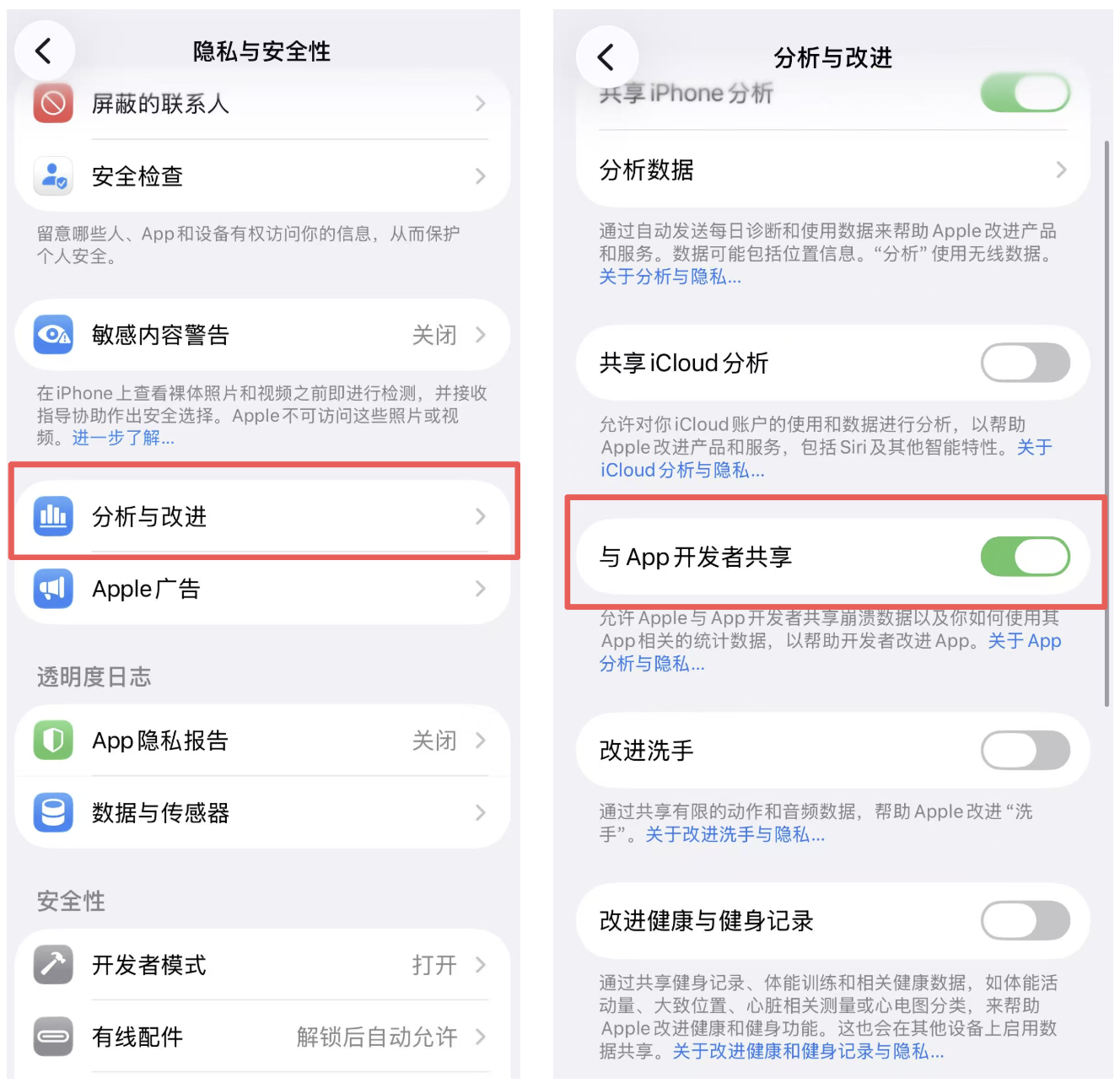 - 打开「设置」→「隐私与安全」→「分析与改进」