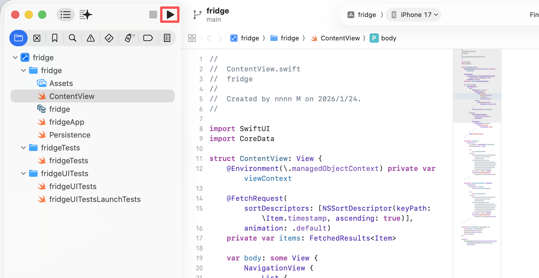 项目创建完成后,Xcode 会自动打开工程。此时不需要理解所有文件,只需要认识几个关键点。