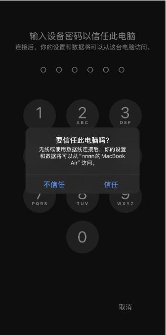 首次连接时,手机会弹出「是否信任此电脑」,选择信任并输入解锁密码。