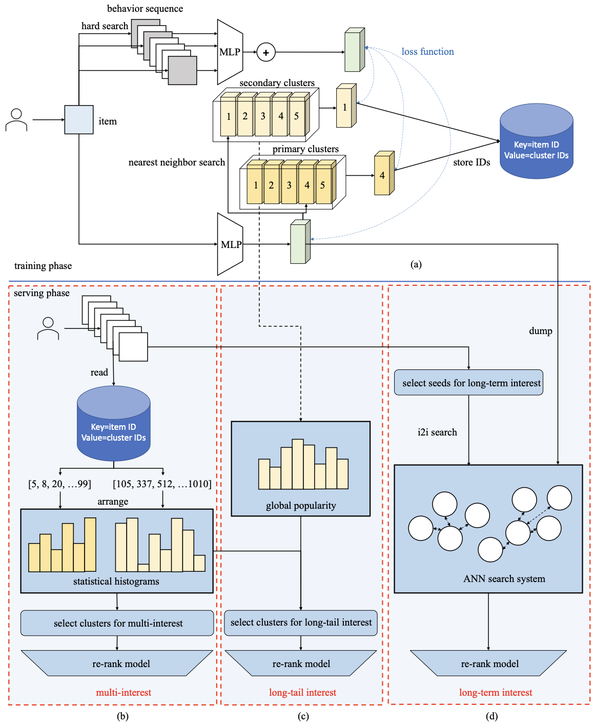 图2.5.1 Trinity框架整体结构。训练阶段(a)通过VQ-VAE构建层次化聚类系统;服务阶段基于用户行为的统计直方图实现多元兴趣召回(b)、长尾兴趣召回(c)和长期兴趣召回(d)。¶