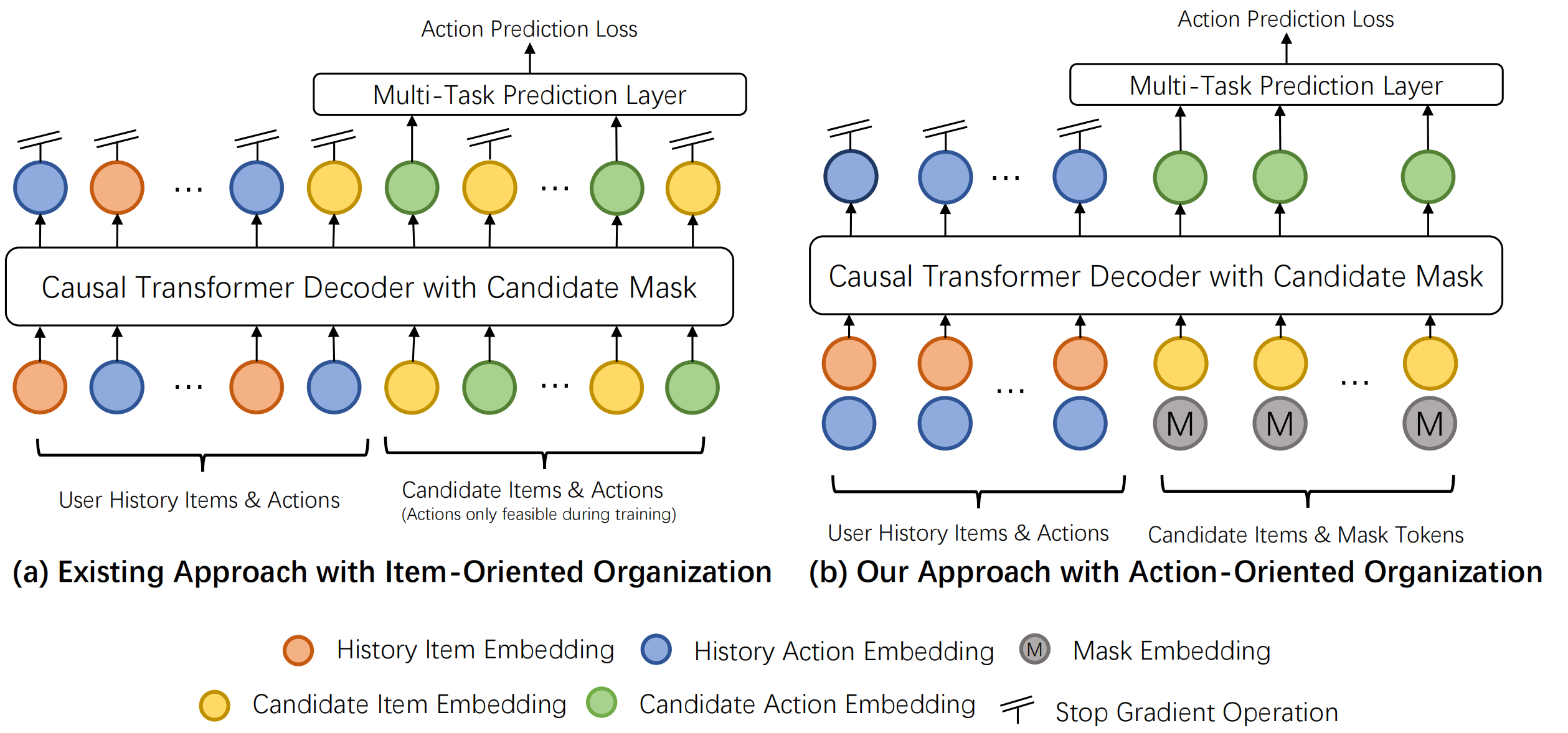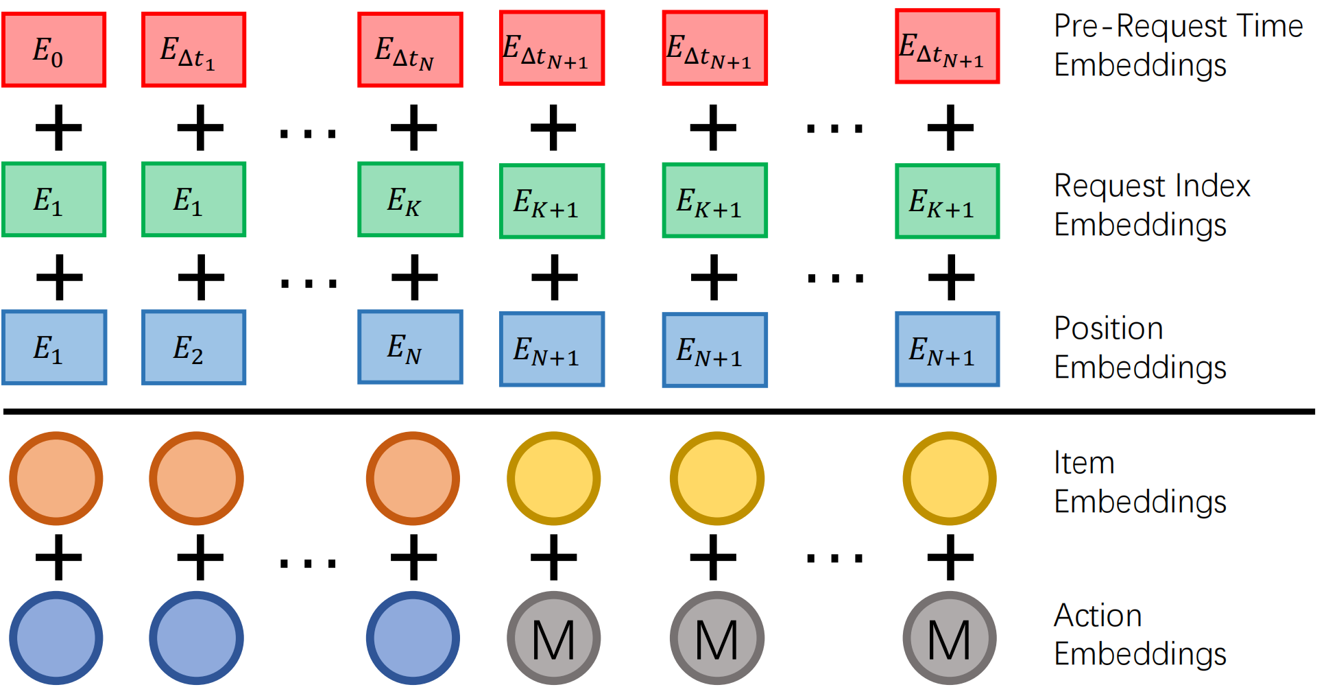 物品embedding和行为embedding在同一空间直接融合。对于候选物品,使用特殊的mask action embedding:\(e_j = \varphi(x_j) + M\)。