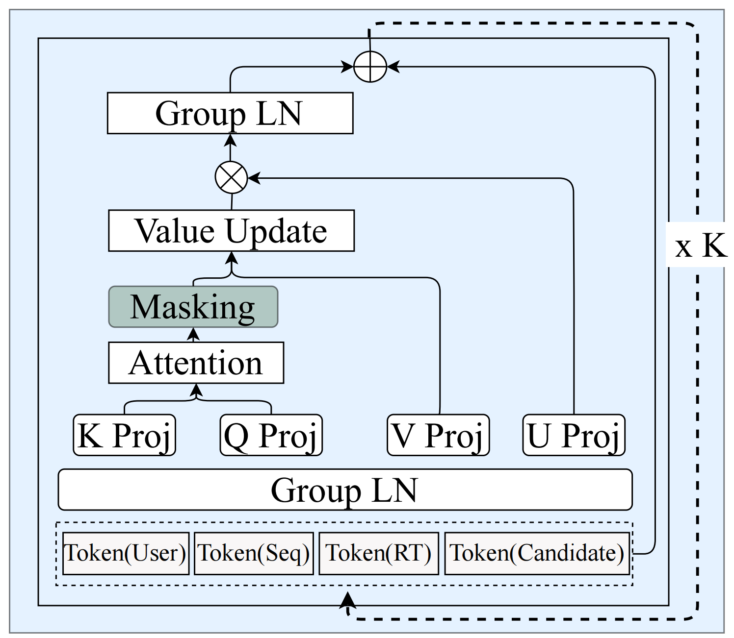 User和Seq tokens被视为“静态”,因为它们来自聚合窗口之前的历史。任何候选都可以attend到这些信息,这是合理的,因为用户的长期历史对所有候选的预测都有意义。