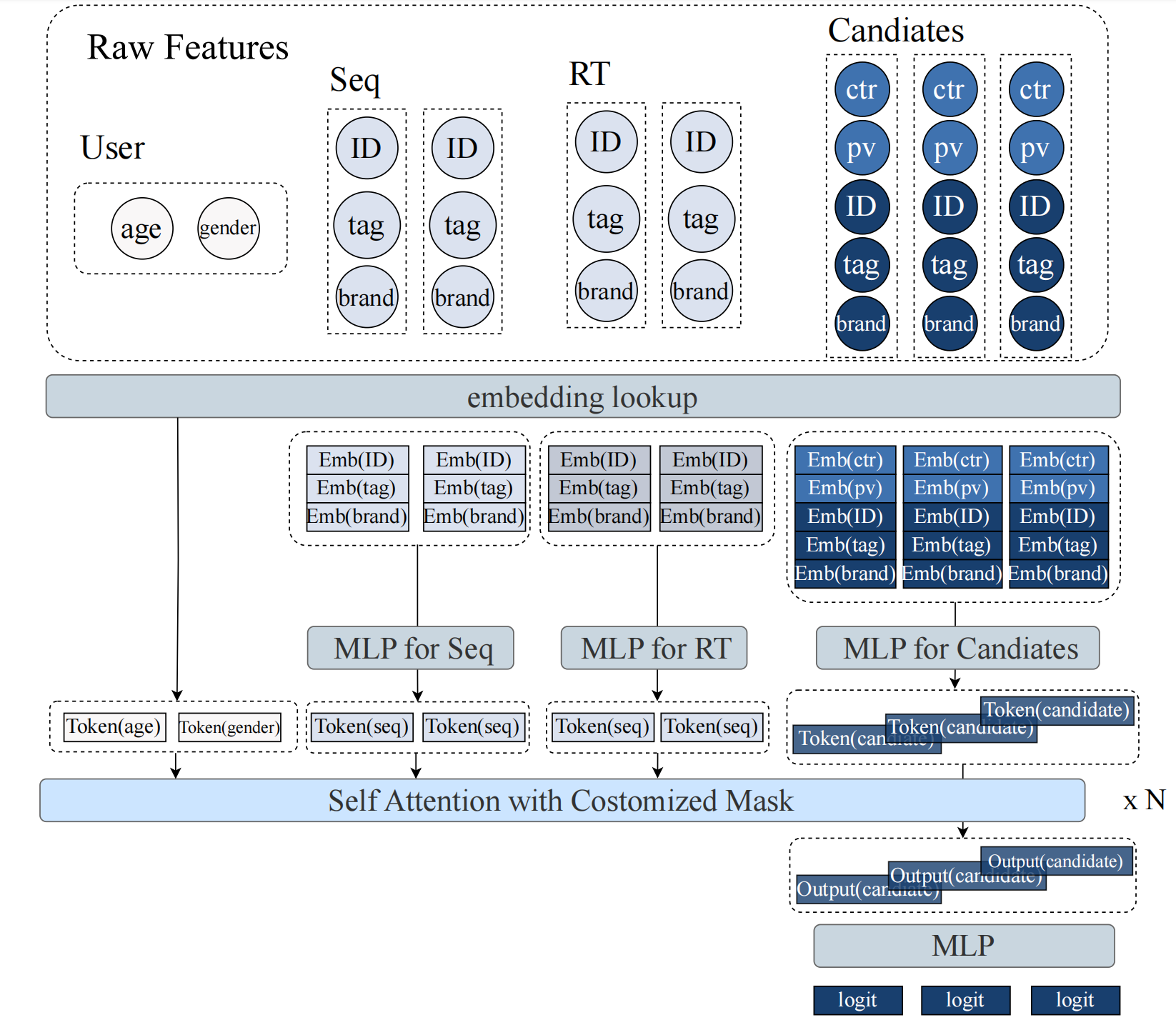 Candidate tokens:每个候选一个token,融合了物品特征和交叉特征