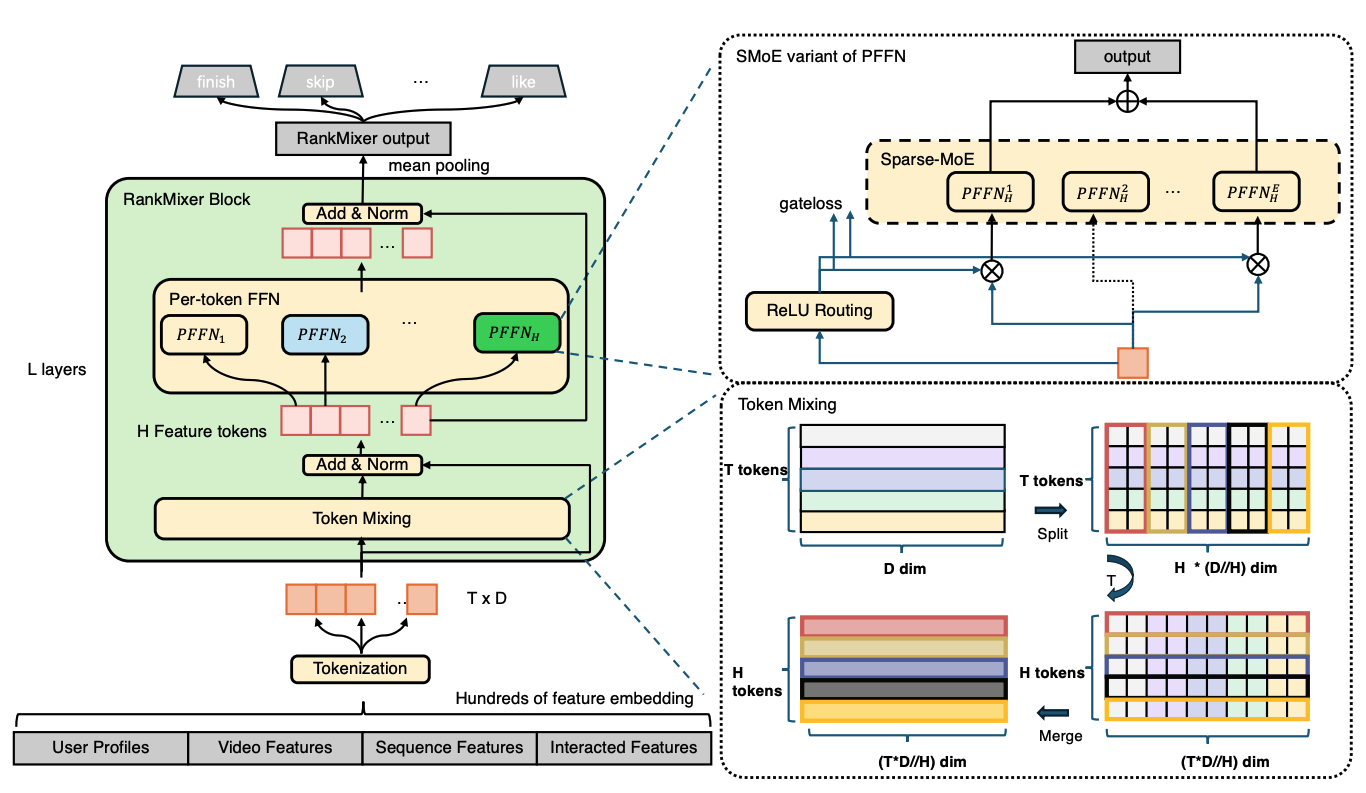 RankMixer (Zhu et al., 2025) 通过hardware-aware的架构设计,从根本上解决了这一问题。其核心原则是从硬件特性反推架构设计,将推荐模型重构为统一的、GPU友好的计算图:用Token Mixing替代Self-Attention以降低复杂度,用Per-Token FFN捕捉特征异质性,用Sparse MoE实现参数高效的模型扩展。