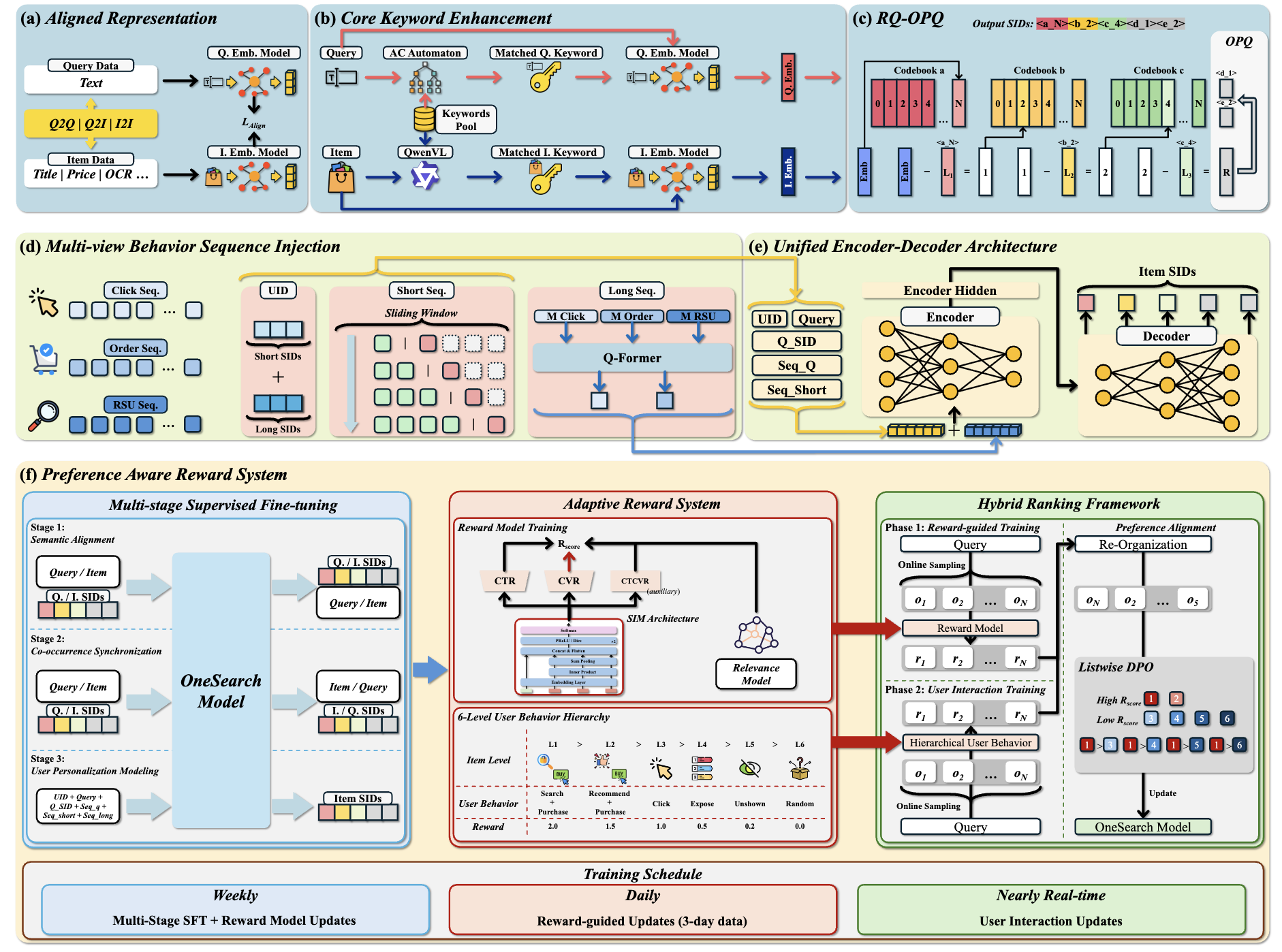 图说明:OneSug 架构包含三个核心模块:(a) PRE 模块通过语义与协同查询增强短前缀表示;(b) Encoder-Decoder 融合用户多尺度特征生成候选查询;(c) RWR 策略利用多级交互反馈优化排序能力。