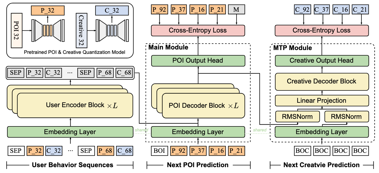 这里 \(K\) 是目标序列长度(通常为 10),\(\mathcal{Y}_{1:i-1}\) 是已生成的 (POI, 创意) 对。MTP 的效果是让两个解码器共享底层表示,加速收敛并提升一致性。
