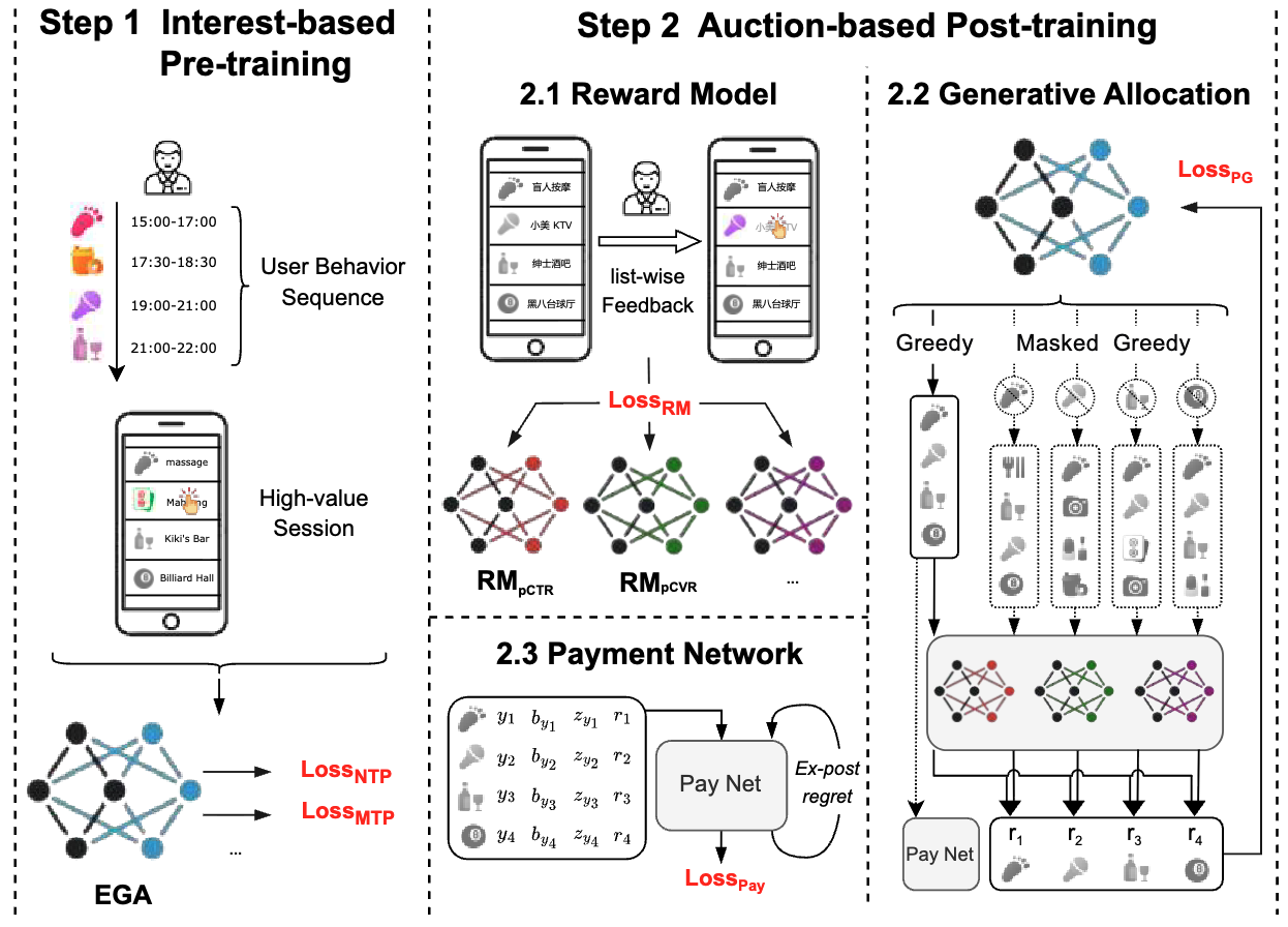EGA 采用“预训练 + 竞价微调”的两阶段训练范式。在预训练阶段,模型忽略竞价信息,专注于从用户历史行为中学习兴趣偏好,构建基础的生成能力。这一阶段的目标是让模型回答:“给定用户的历史行为,他接下来可能对哪些 POI 和创意感兴趣?”
