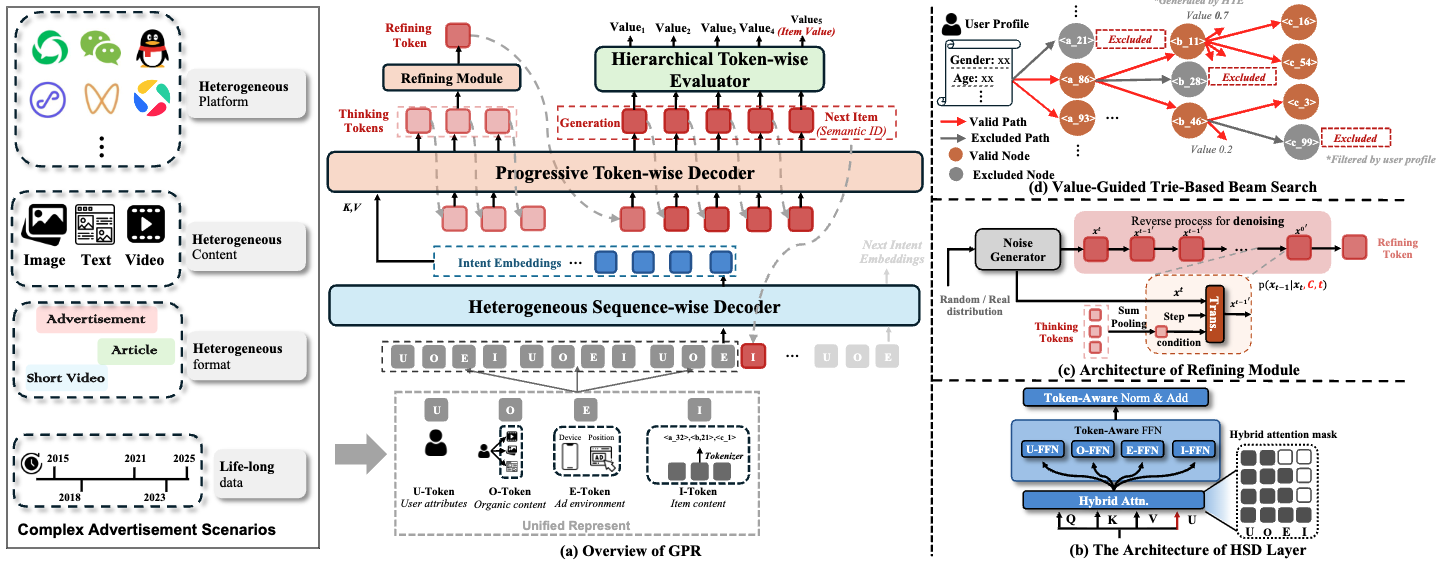 端到端生成式广告系统需要解决三个核心挑战:如何将竞价机制深度融入生成过程、如何保证广告主的激励相容性(Incentive Compatibility)、如何在超长异构序列中高效建模用户意图。本节将介绍两个代表性的工业解决方案:EGA(End-to-end Generative Advertising)将竞价机制与生成模型统一,通过 Token 级竞价和 POI 级支付的双层设计实现了激励相容性约束;GPR(Generative Pre-trained Recommender)则通过异构层次化解码器和预训练范式,在微信生态的多场景超长序列中实现了统一的广告生成能力。