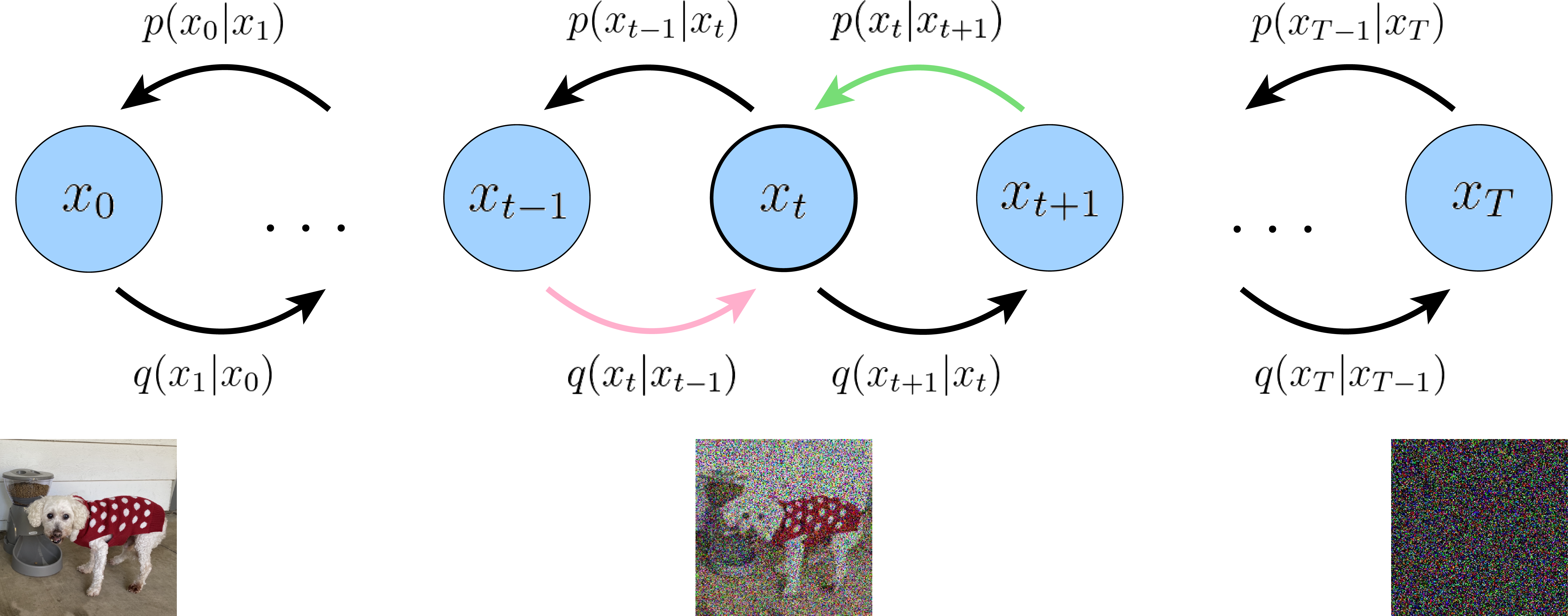 图9.1.1 前向扩散和反向去噪过程的示意图¶
