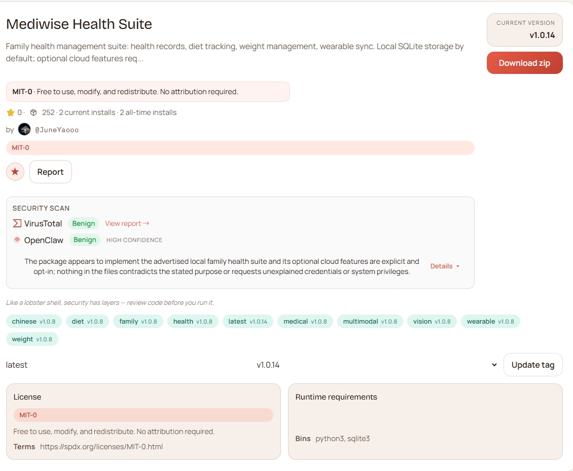 - ClawHub: https://clawhub.ai/JuneYaooo/mediwise-health-suite
