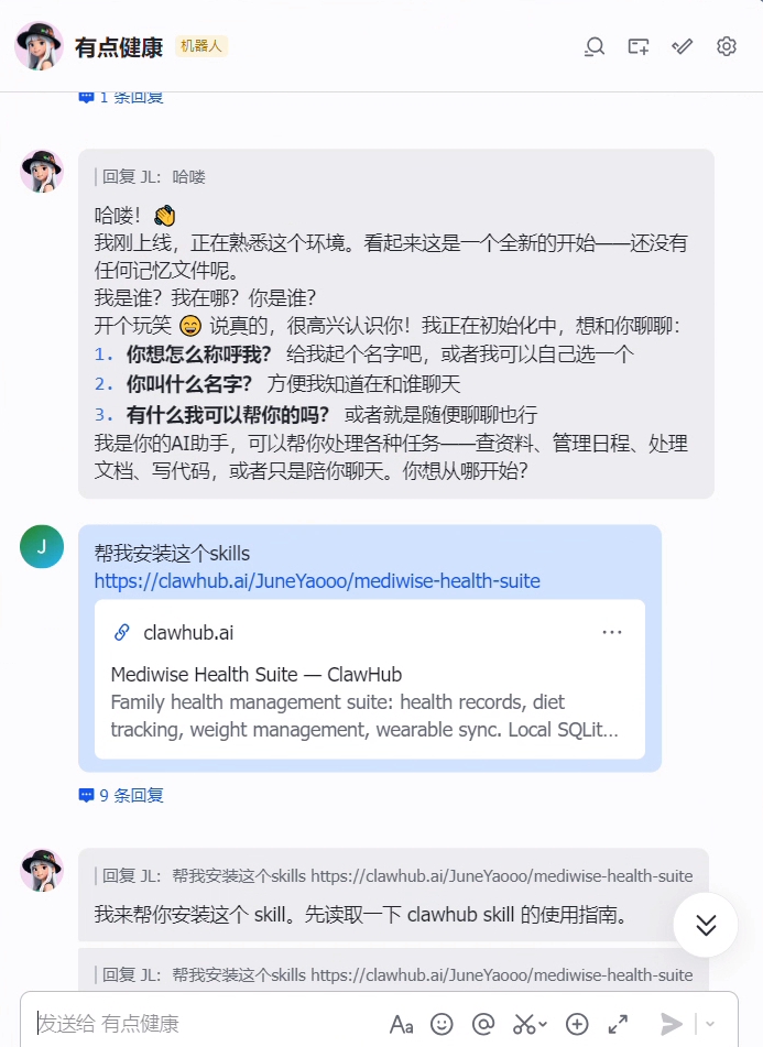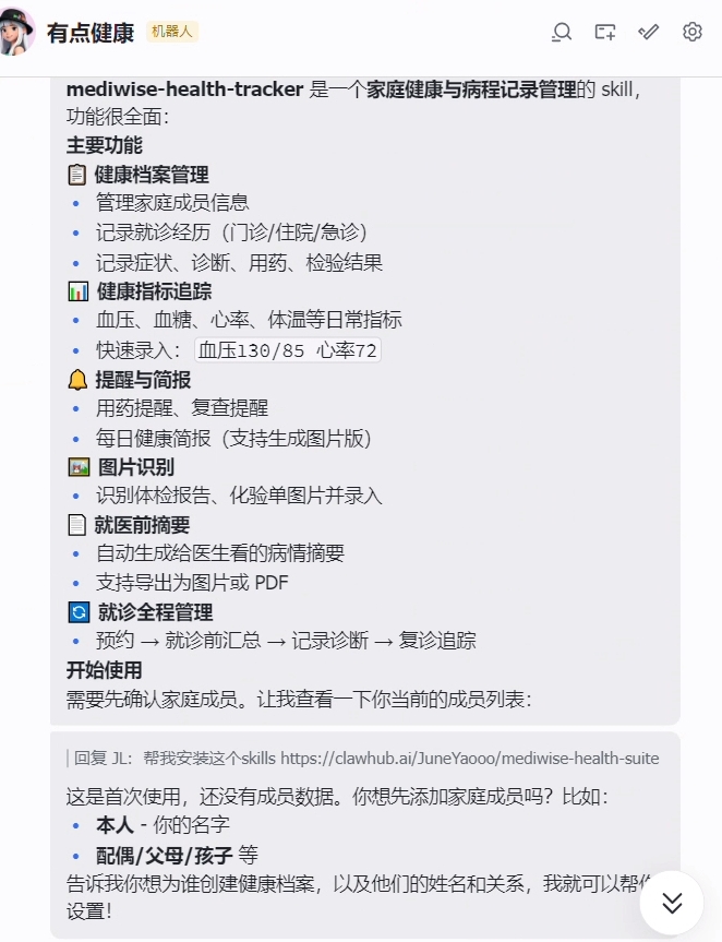 clawdhub install JuneYaooo/mediwise-health-suiteNote: Make sure to enter the correct workspace before installing, to avoid triggering the