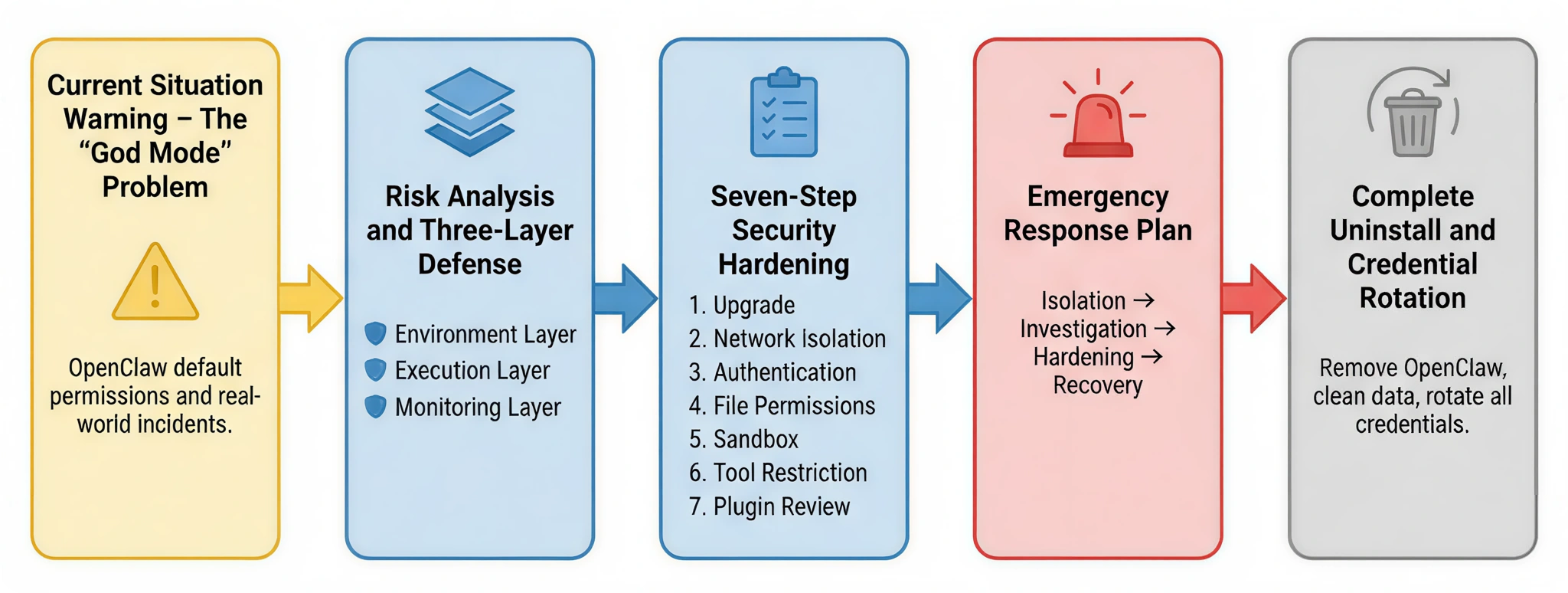 This article starts from real-world security risks, analyzes the problems an AI Agent can cause under "god mode" permissions, and introduces a three-layer defense architecture as an overarching security philosophy. Building on that foundation, it provides a seven-step security hardening plan you can act on immediately. If your system is already showing anomalies, you can follow the incident response process to contain and investigate damage; in the most extreme cases, a guide to complete uninstallation and credential rotation is also provided to ensure the system is fully restored to a safe state.
