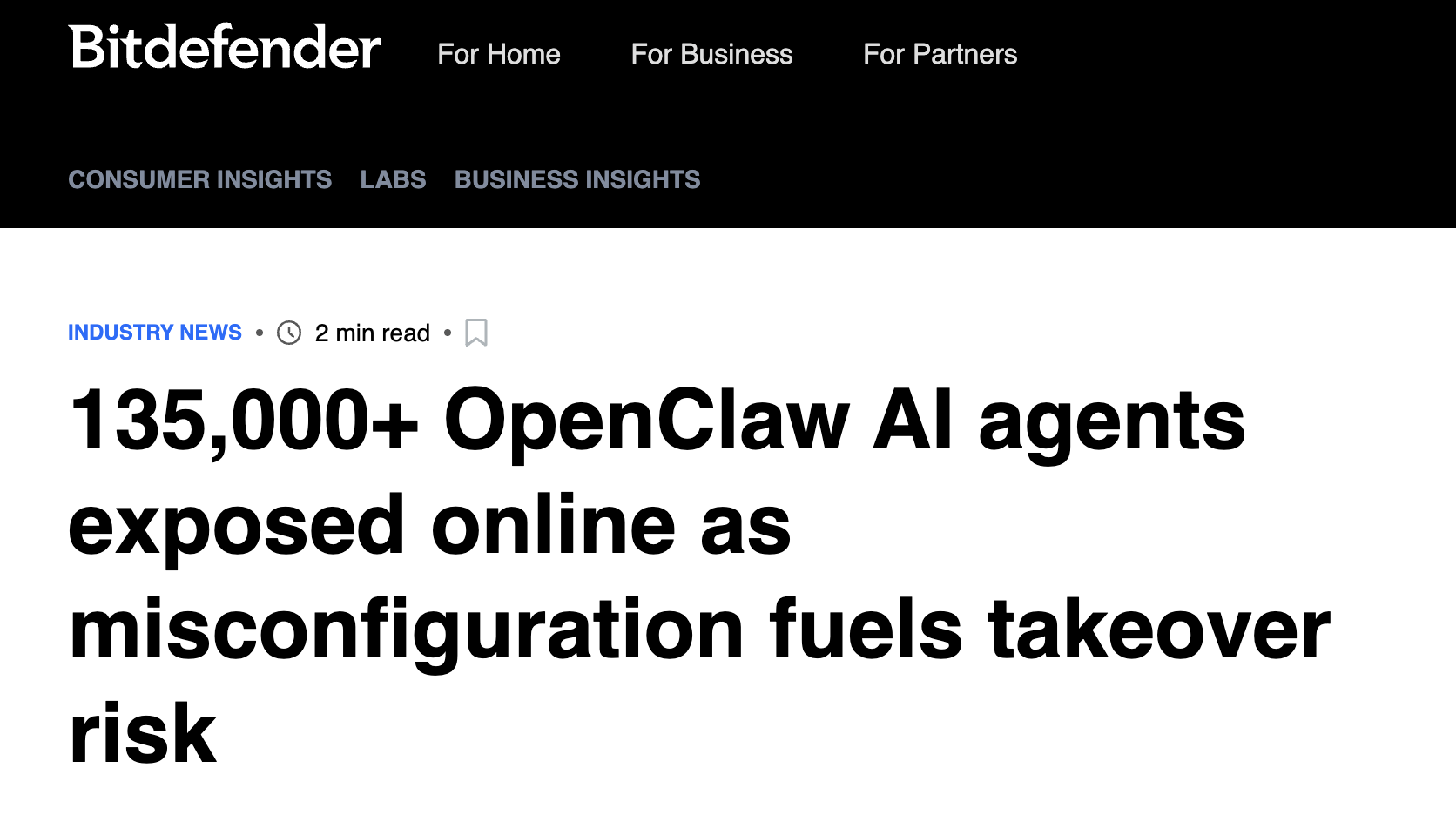 - Bitdefender. (2026). "135K OpenClaw AI Agents Exposed to Internet"