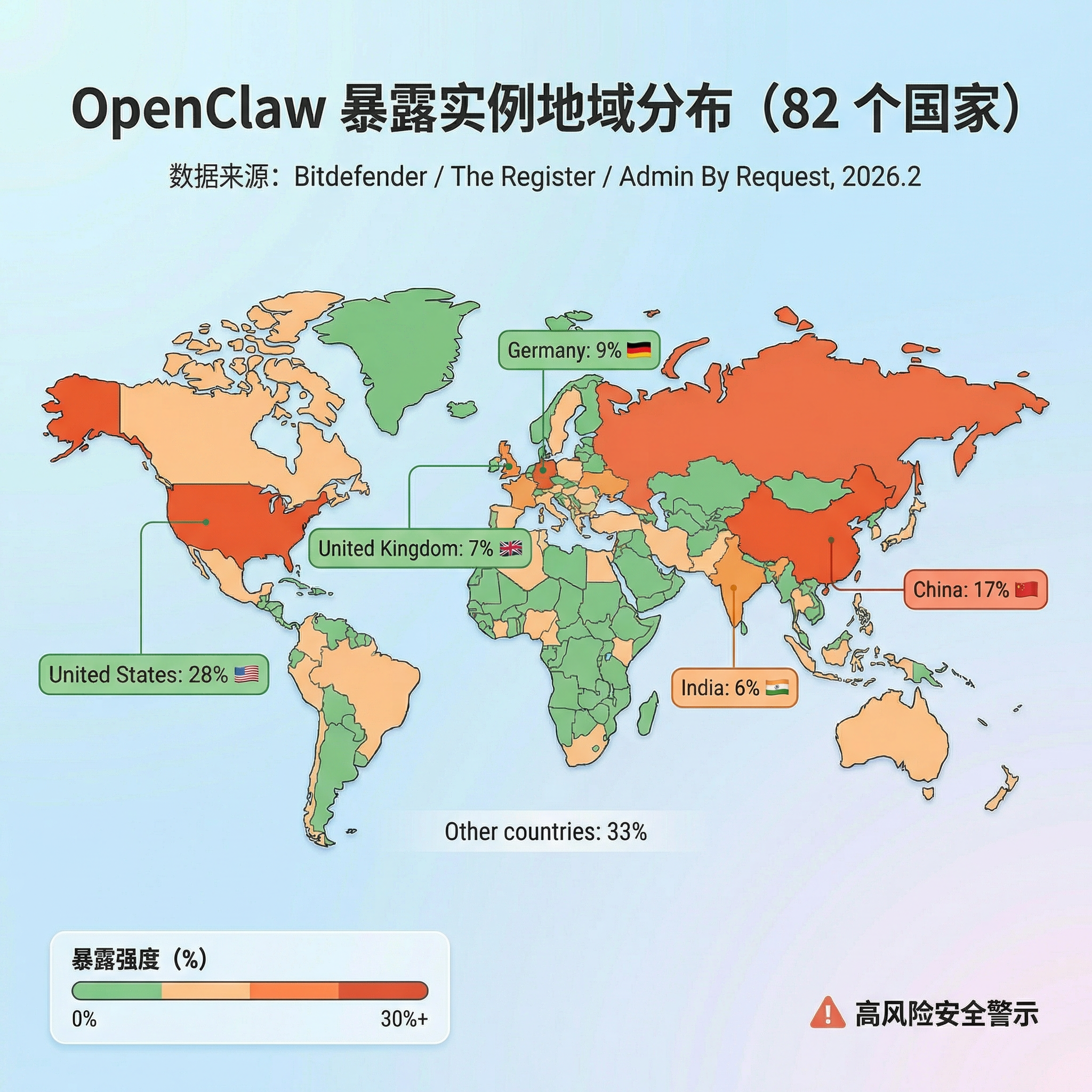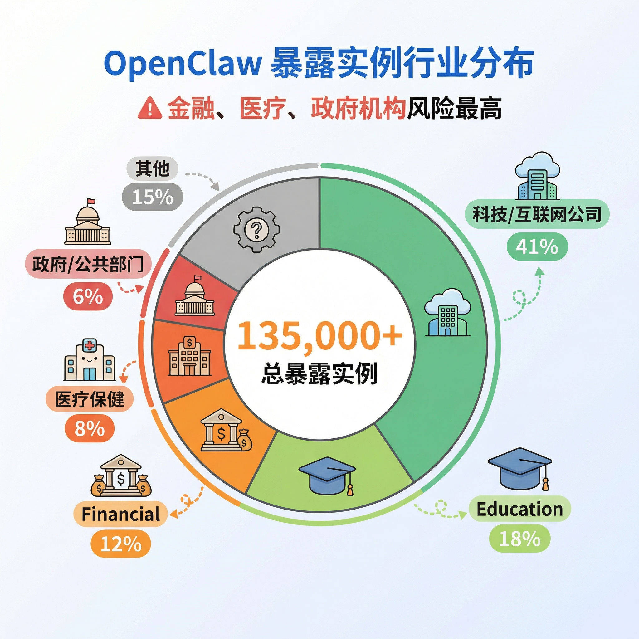 Looking at the geographic breakdown, the United States (28%), China (17%), Germany (9%), the United Kingdom (7%), and India (6%) are the five countries with the most exposed instances. By industry, internet and technology companies account for the highest share (41%), but finance, healthcare, and government systems combined account for 26% of exposed instances — and their risk is actually higher because those systems typically involve sensitive personal information and critical business data. Put simply: many lobsters have already been dropped straight into the public internet, permissions and all.
