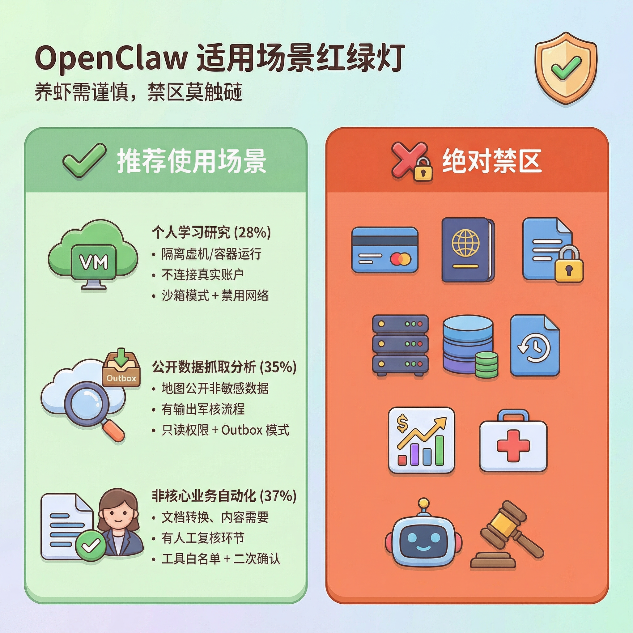 A simple guiding principle: if a problem with this system would affect real users, money, or critical business operations, do not let the lobster roam around inside on its own. Raising lobsters is fine, but watch the pond — some places are suitable for raising them, and some places should not even have a lobster shell brought in. Raise lobsters with care; never touch the forbidden zones.