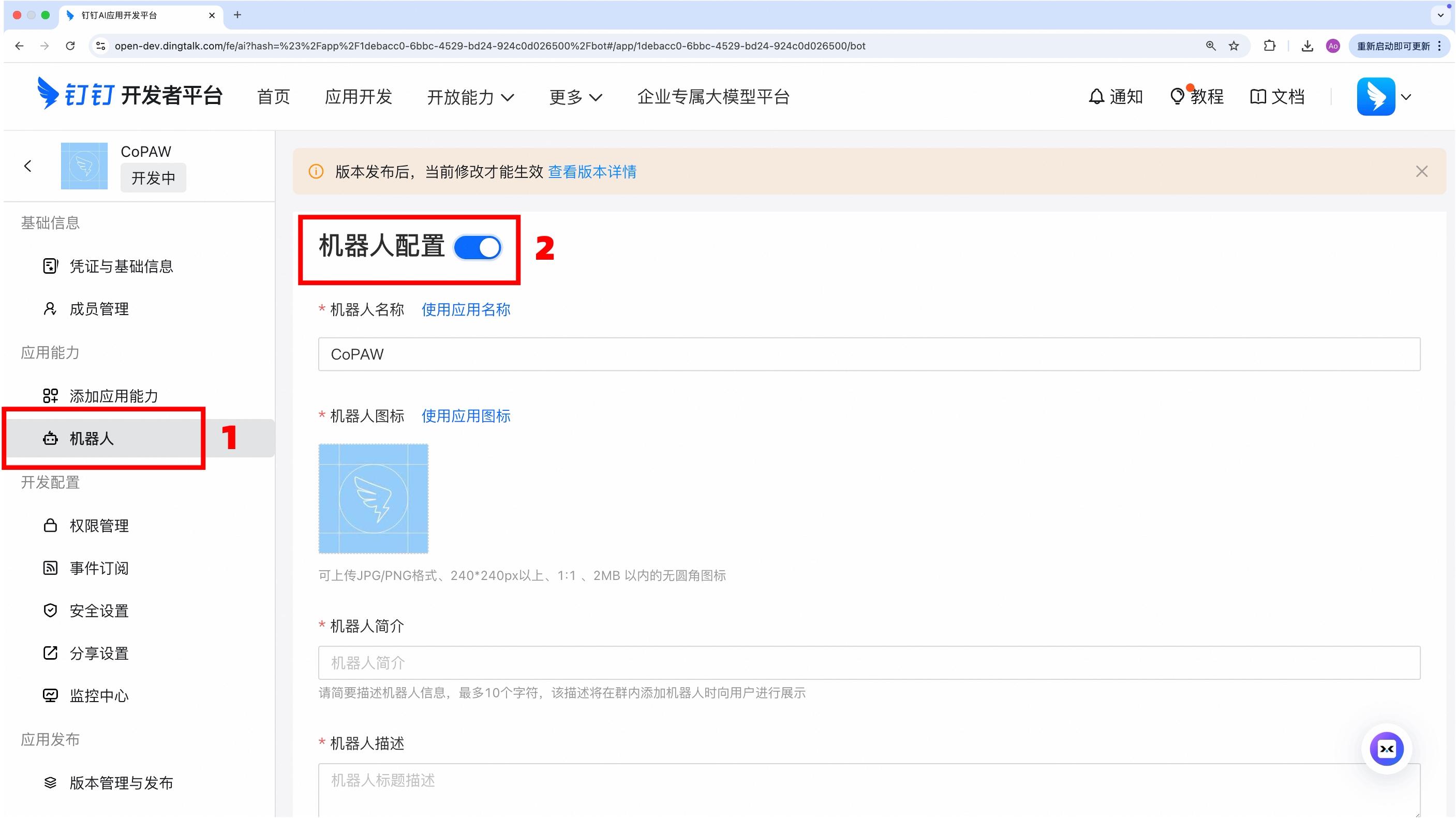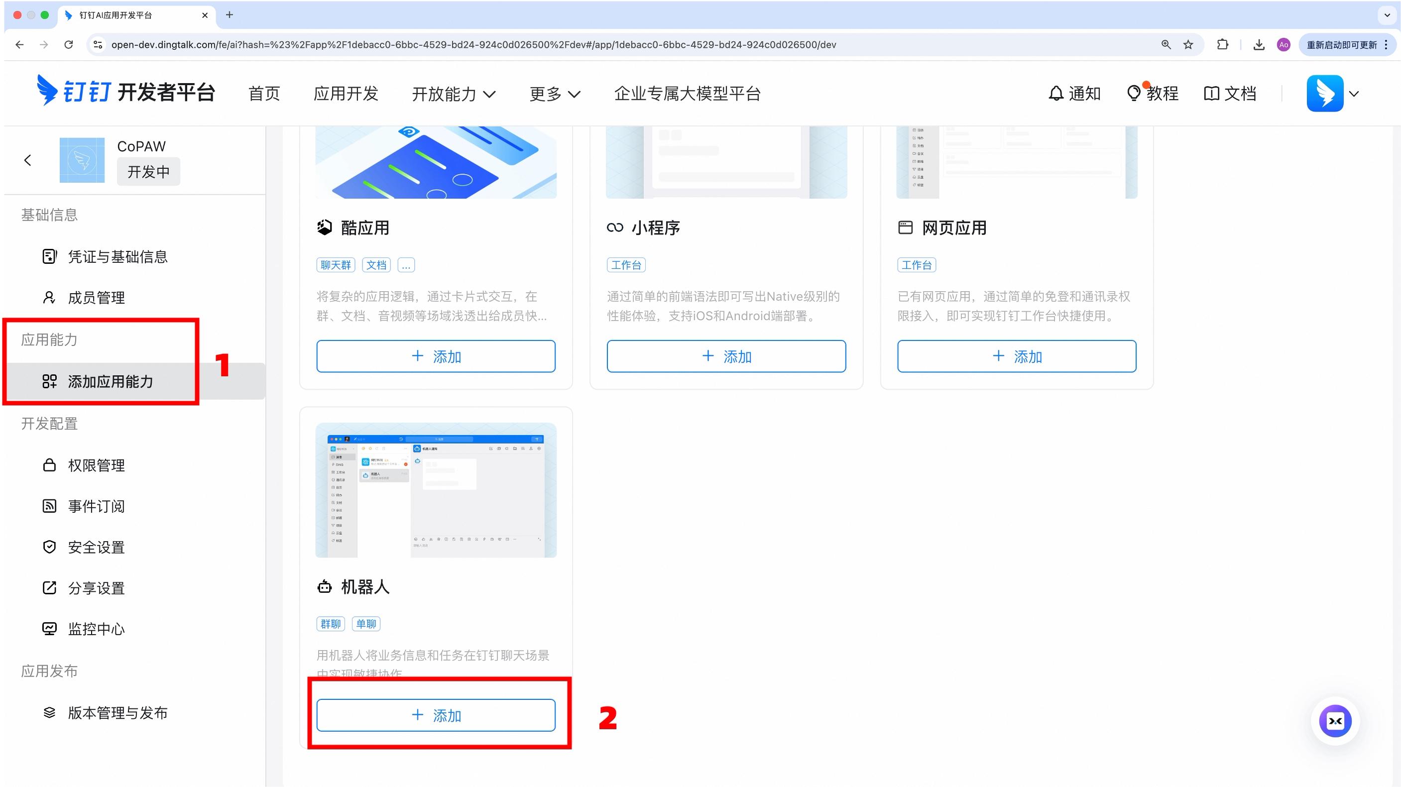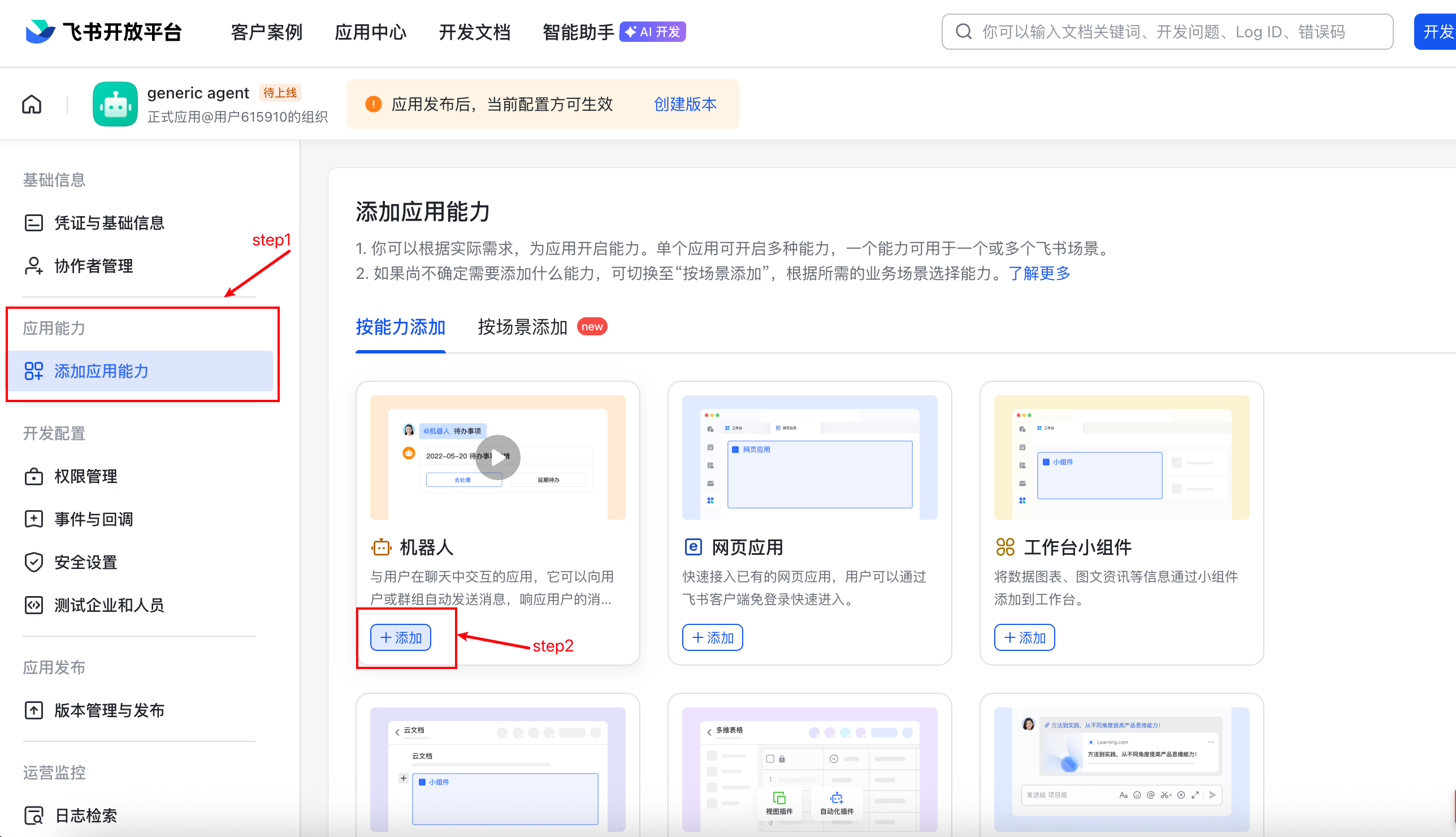 - 应用详情 → 应用能力 → 添加应用能力 → 机器人