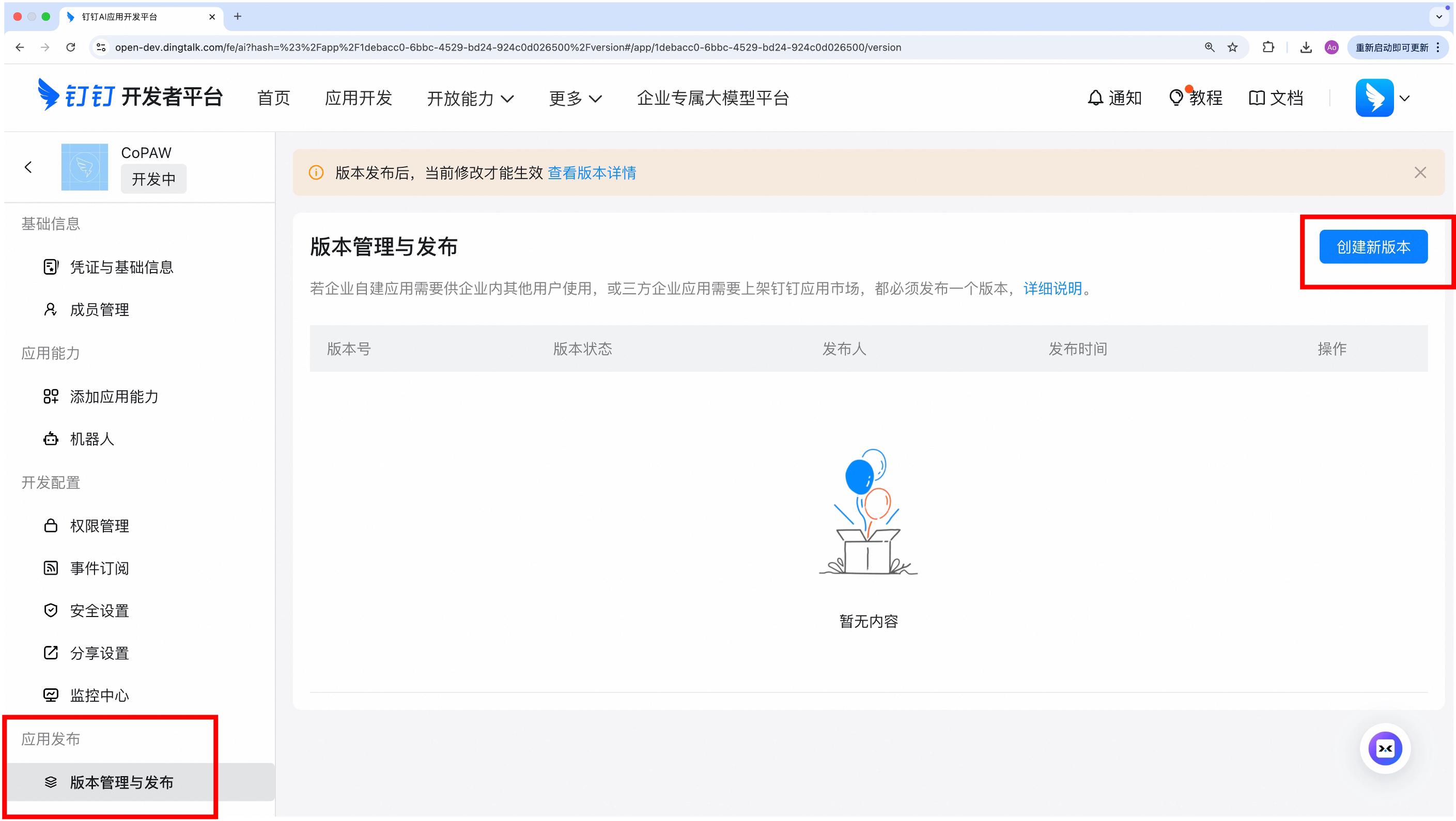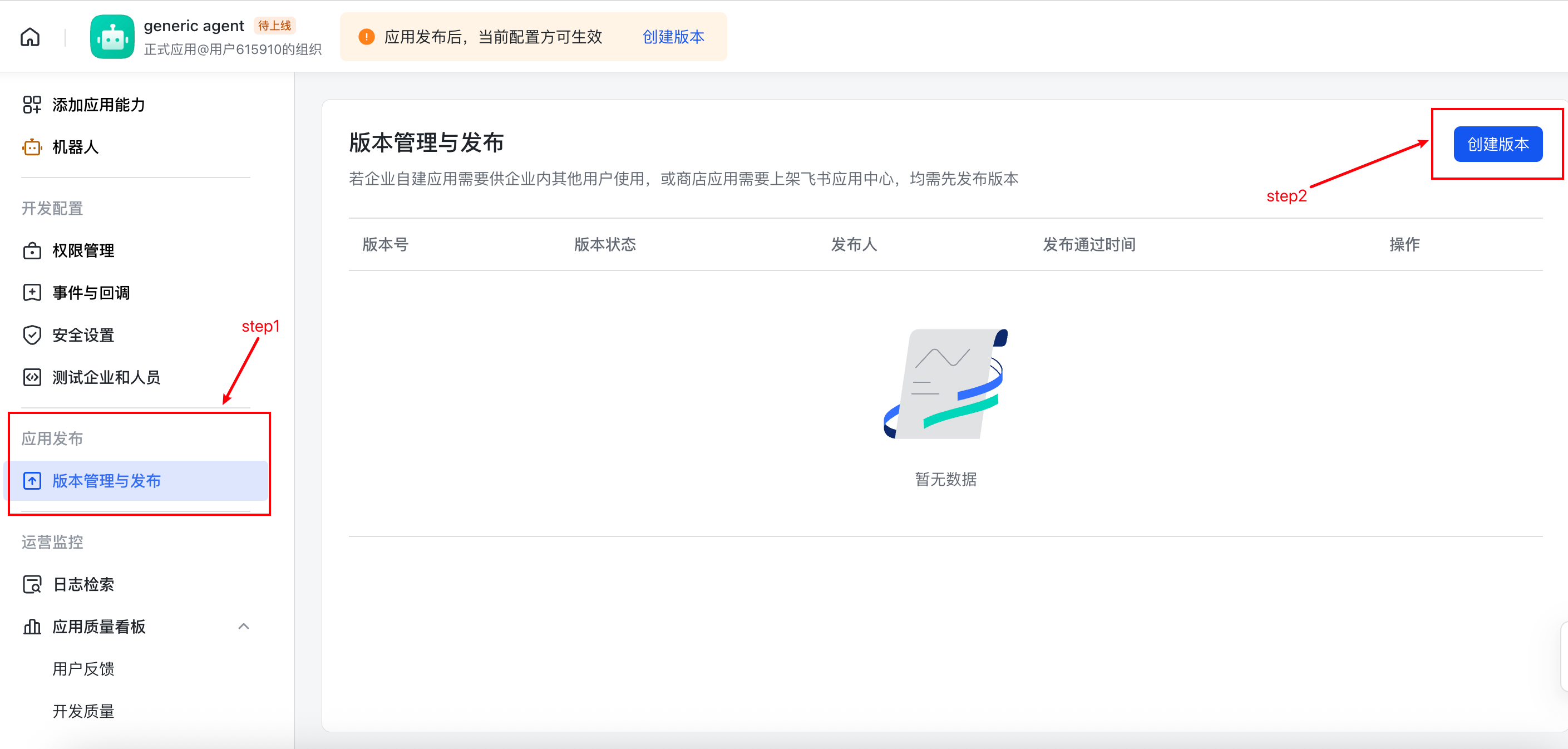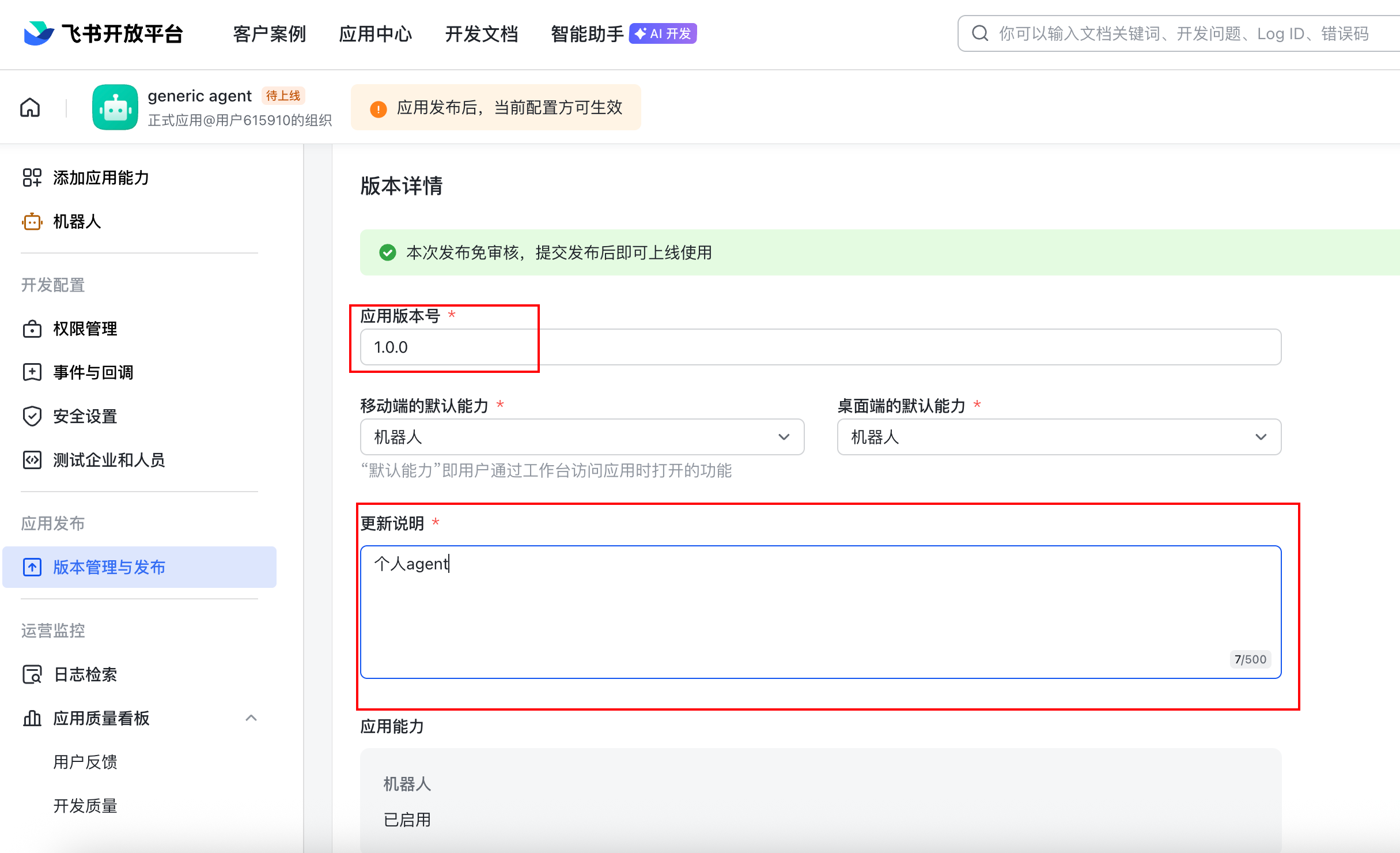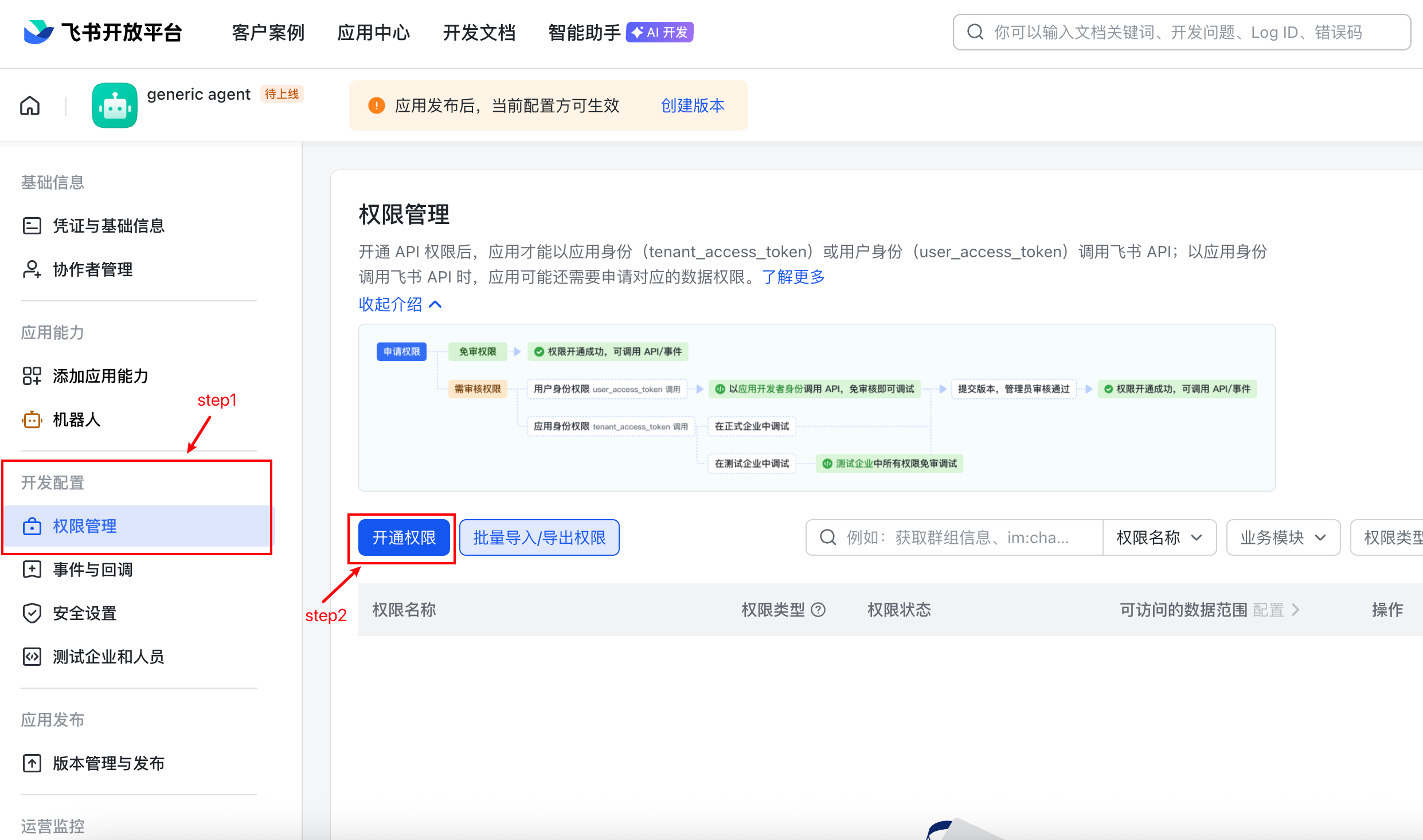 - 应用发布 → 版本管理与发布 → 创建新版本 → 发布,等待审批通过