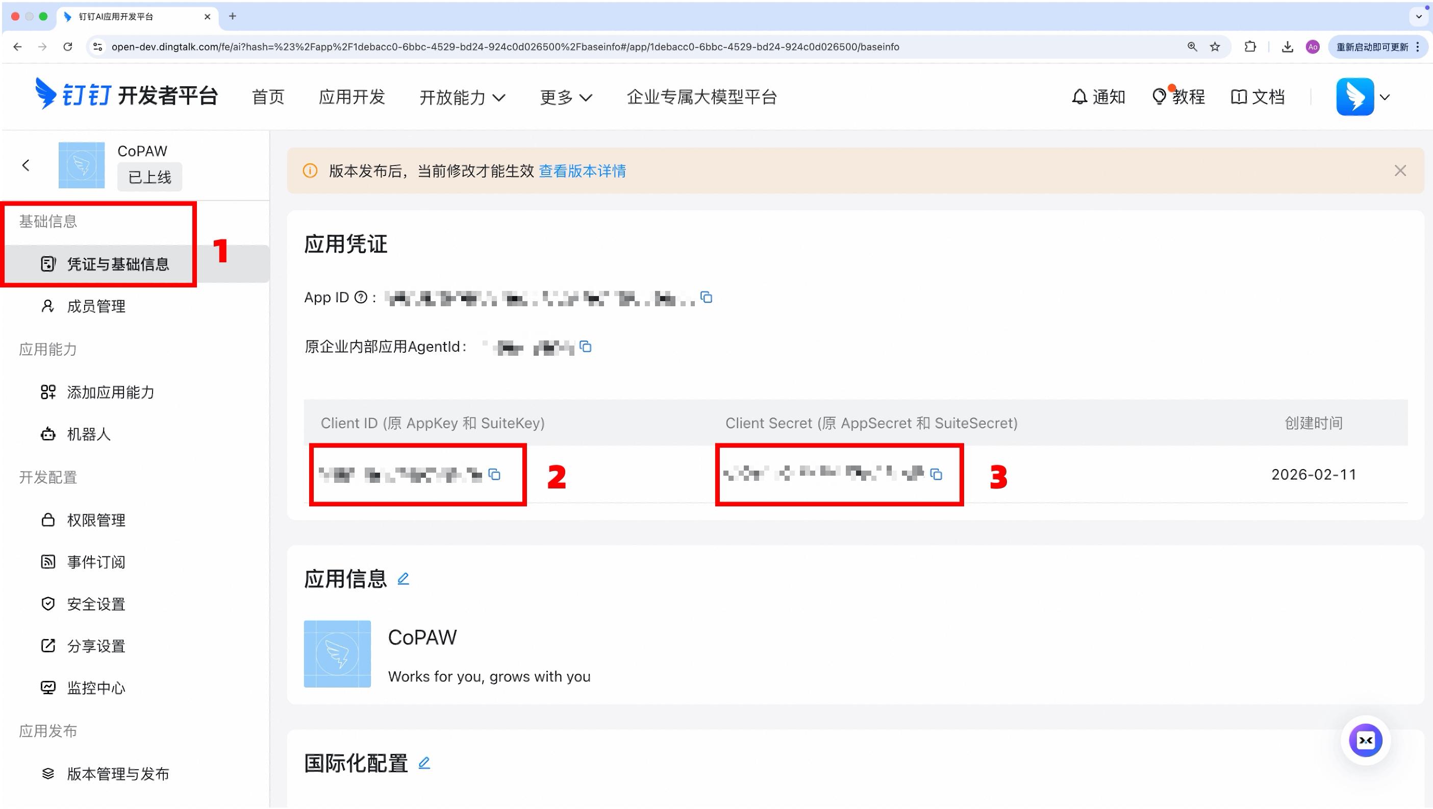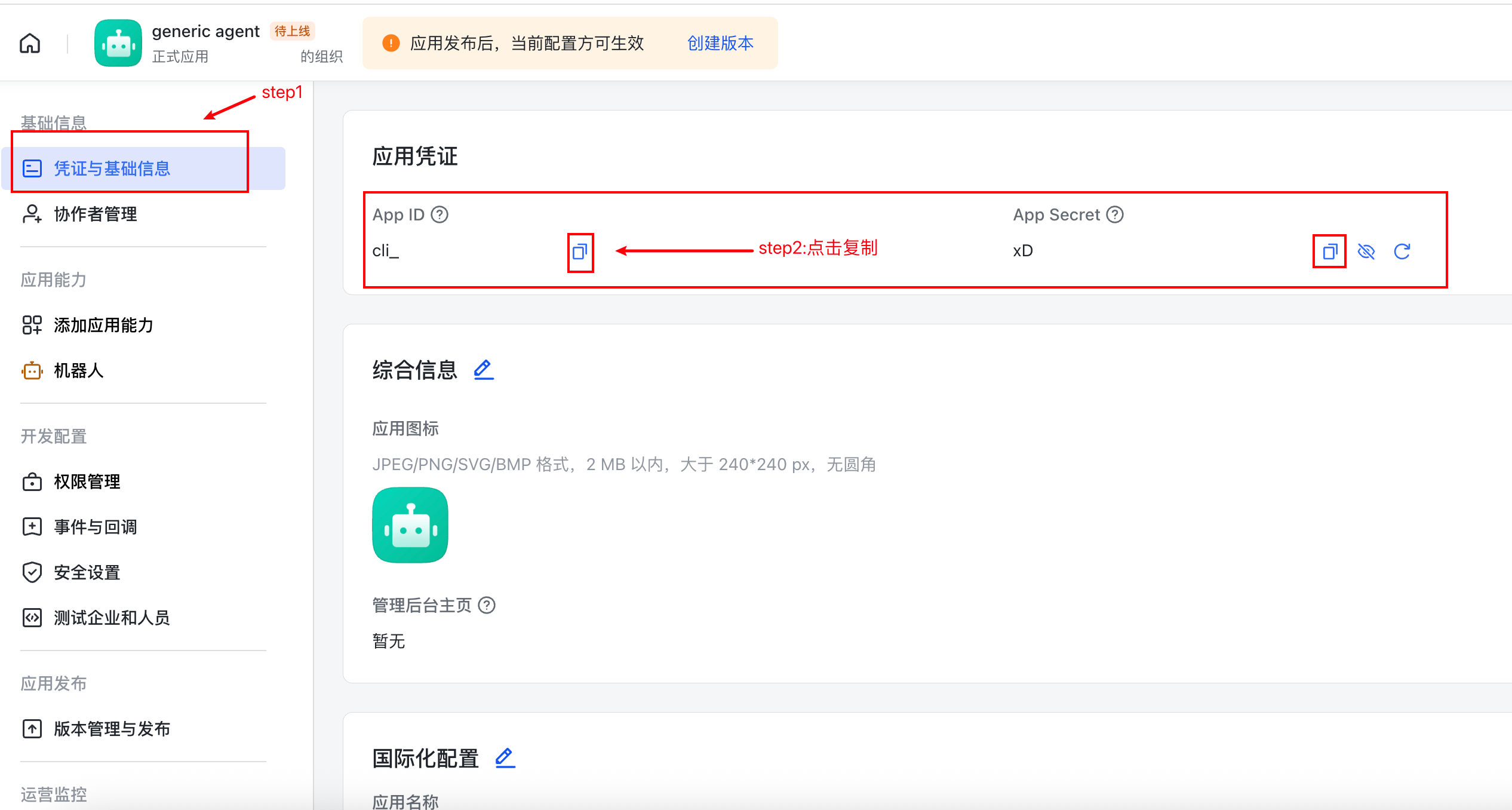 - 左侧菜单「凭证与基础信息」,记录 App ID 和 App Secret