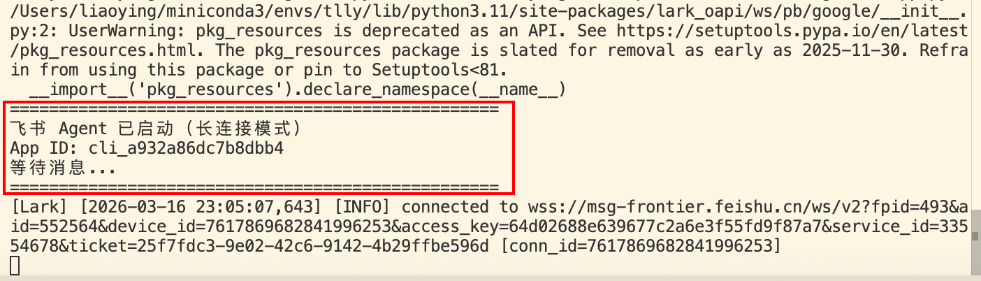 - 启动飞书前端,看到「等待消息…」表示服务已就绪: