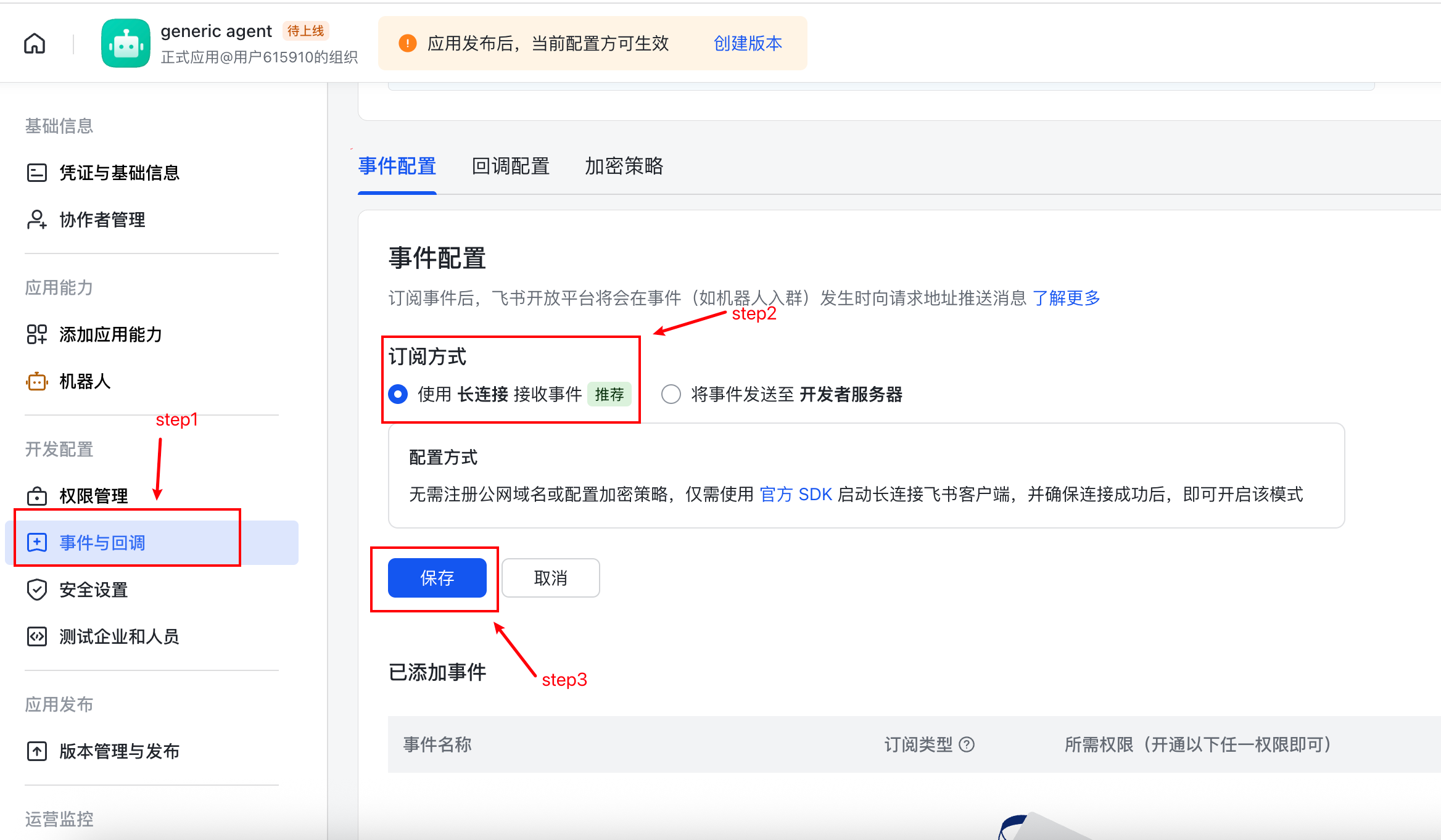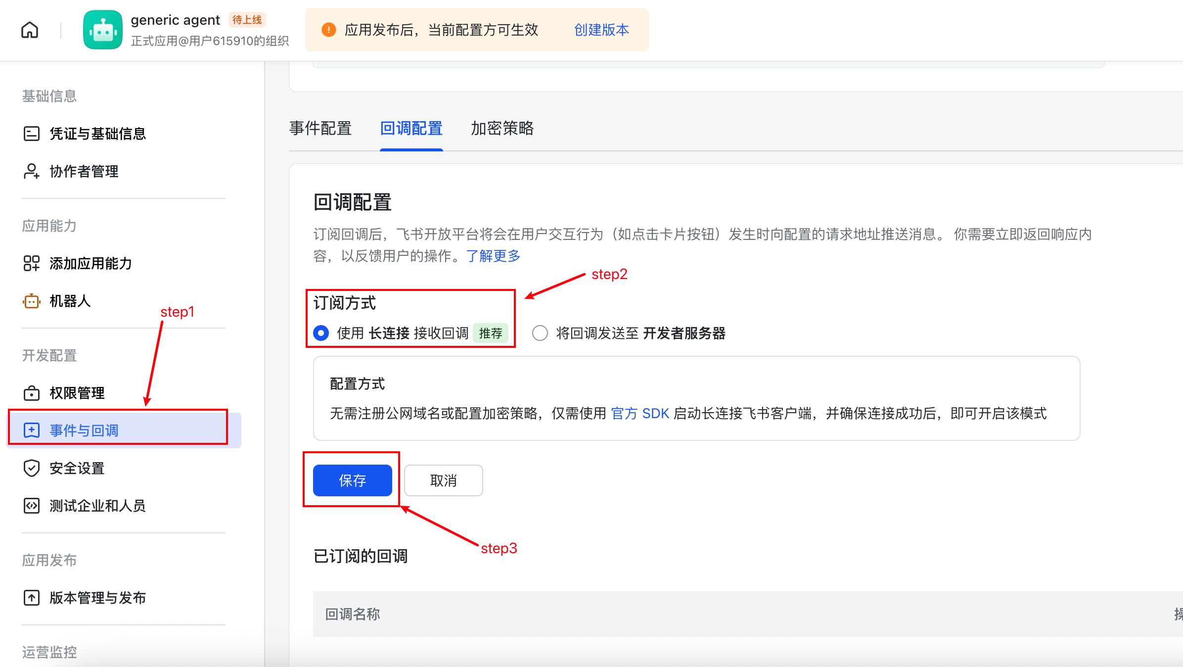 - 点击「回调配置」→ 订阅方式选择「使用长连接接收事件」