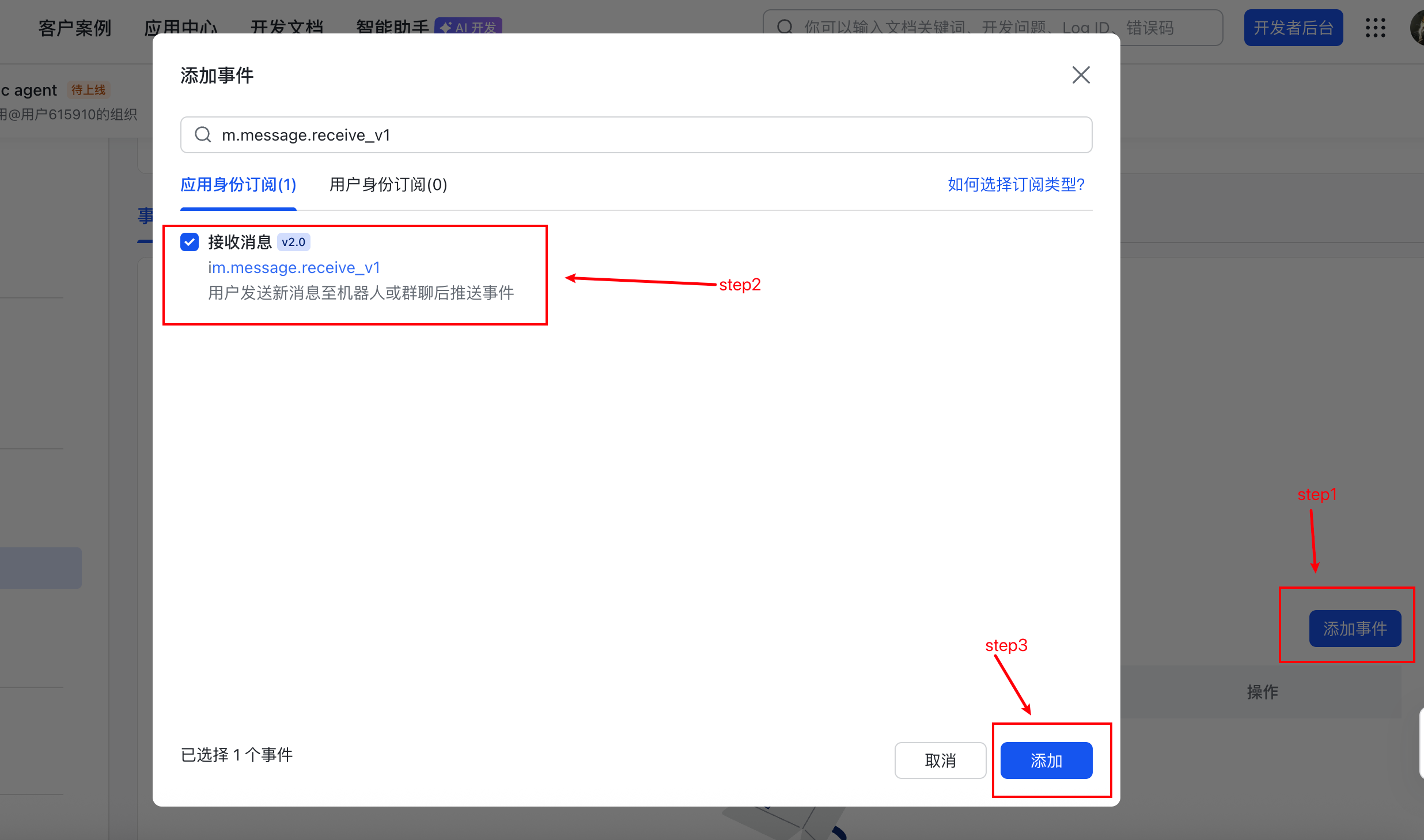 - 点击「事件配置」→ 同样选择「长连接」→ 点击「添加事件」→ 搜索添加