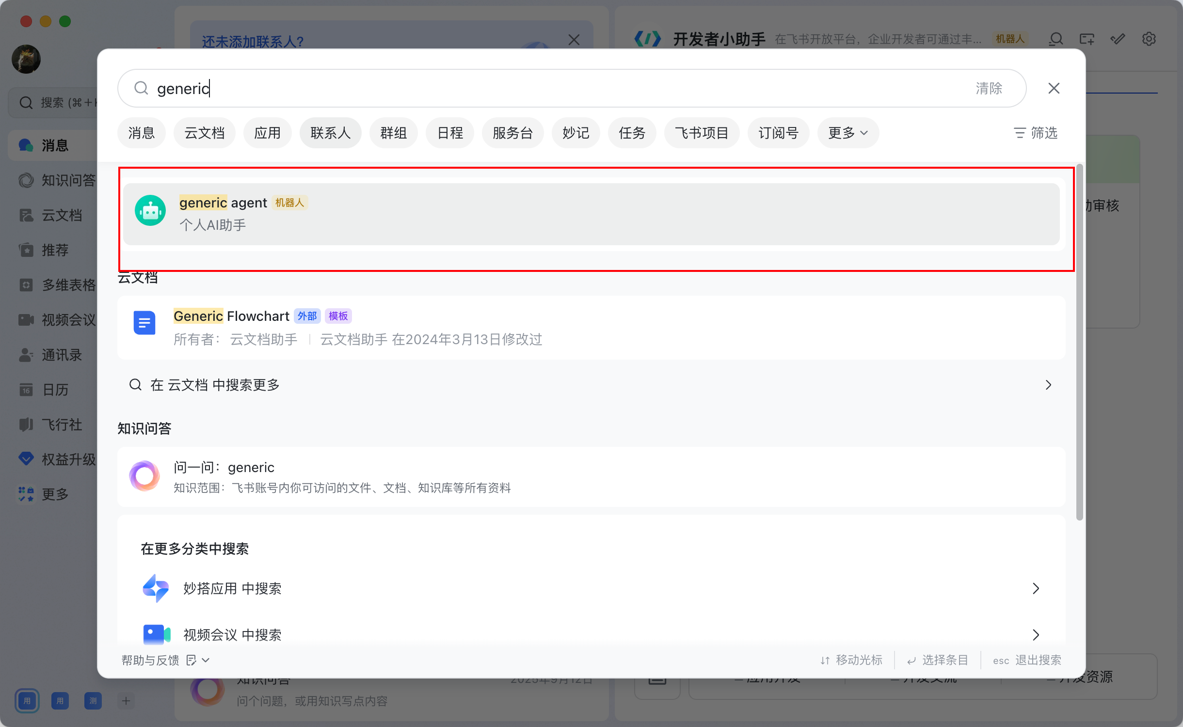 ![]() 搜索框搜索你建立的个人助手名字 | ![]() 在对话框中输入问题,手机版飞书也能继续对话 |