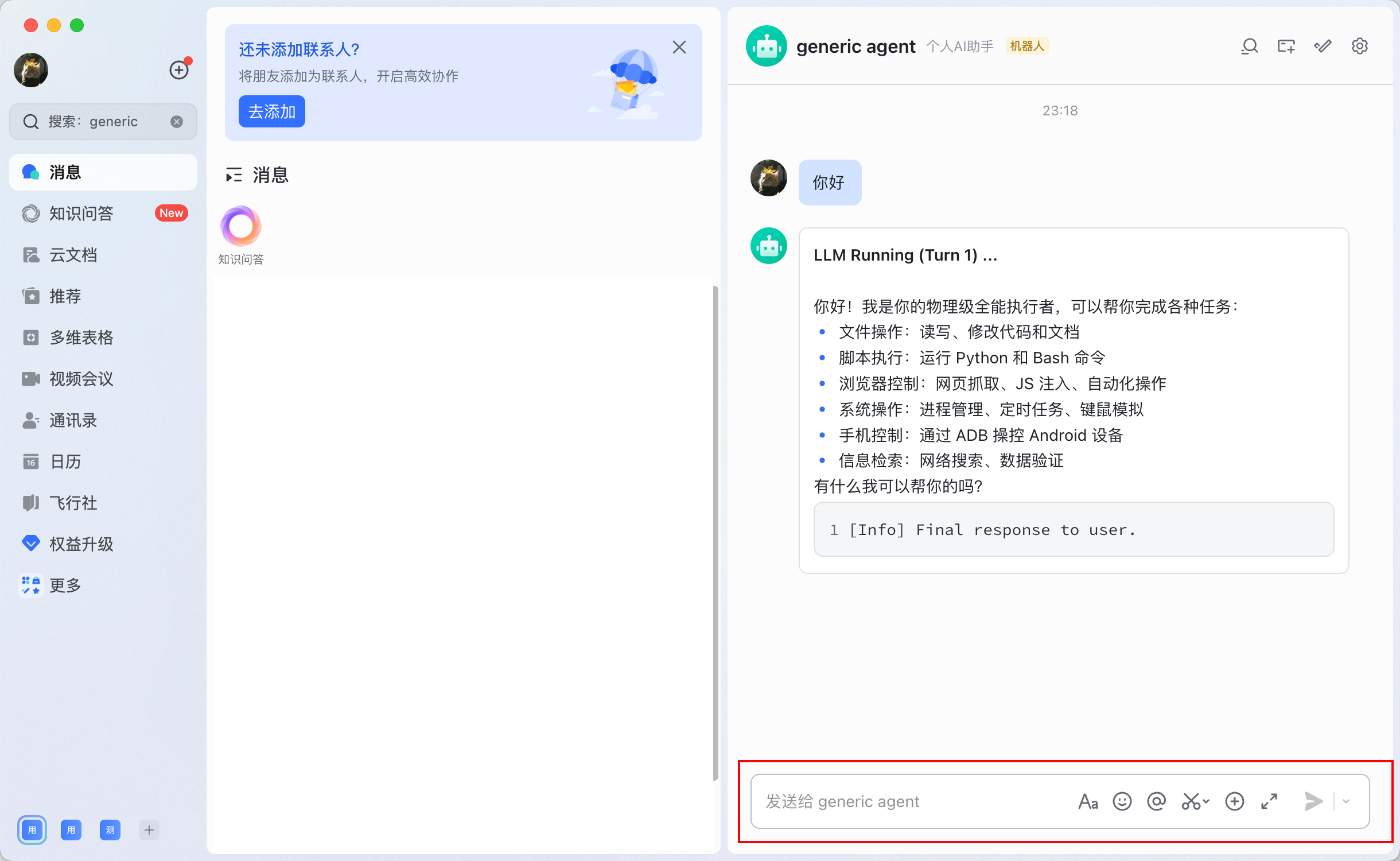 - 降低门槛:非技术用户也能通过熟悉的聊天界面使用 Agent