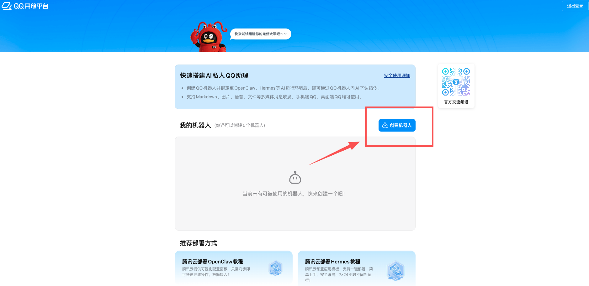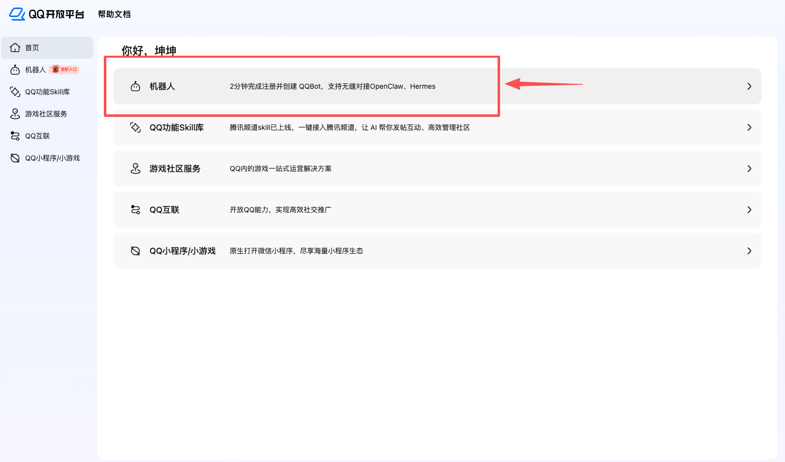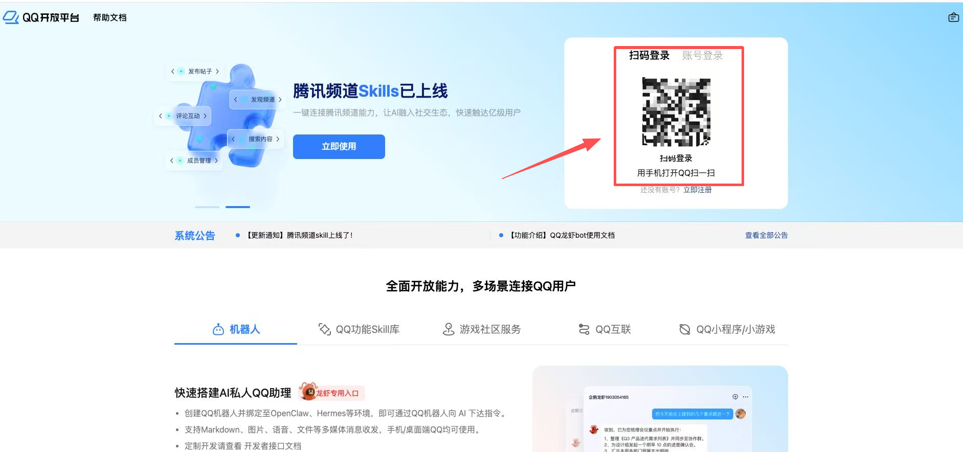 - 打开 QQ 开放平台,扫码登录 → 选择「机器人」选项