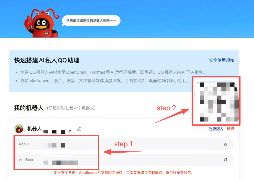 - 获取 AppID 和 AppSecret(见 step1),QQ 扫码进入机器人对话窗口(见 step2)