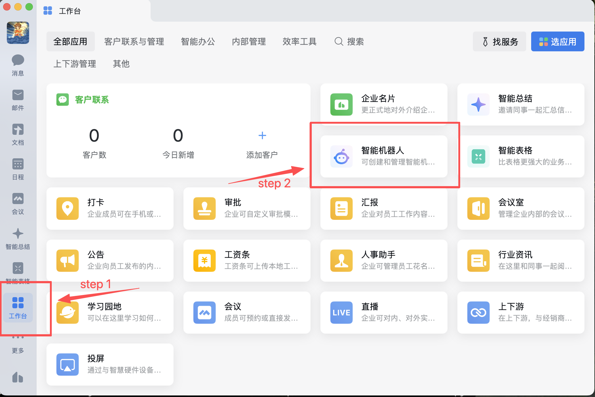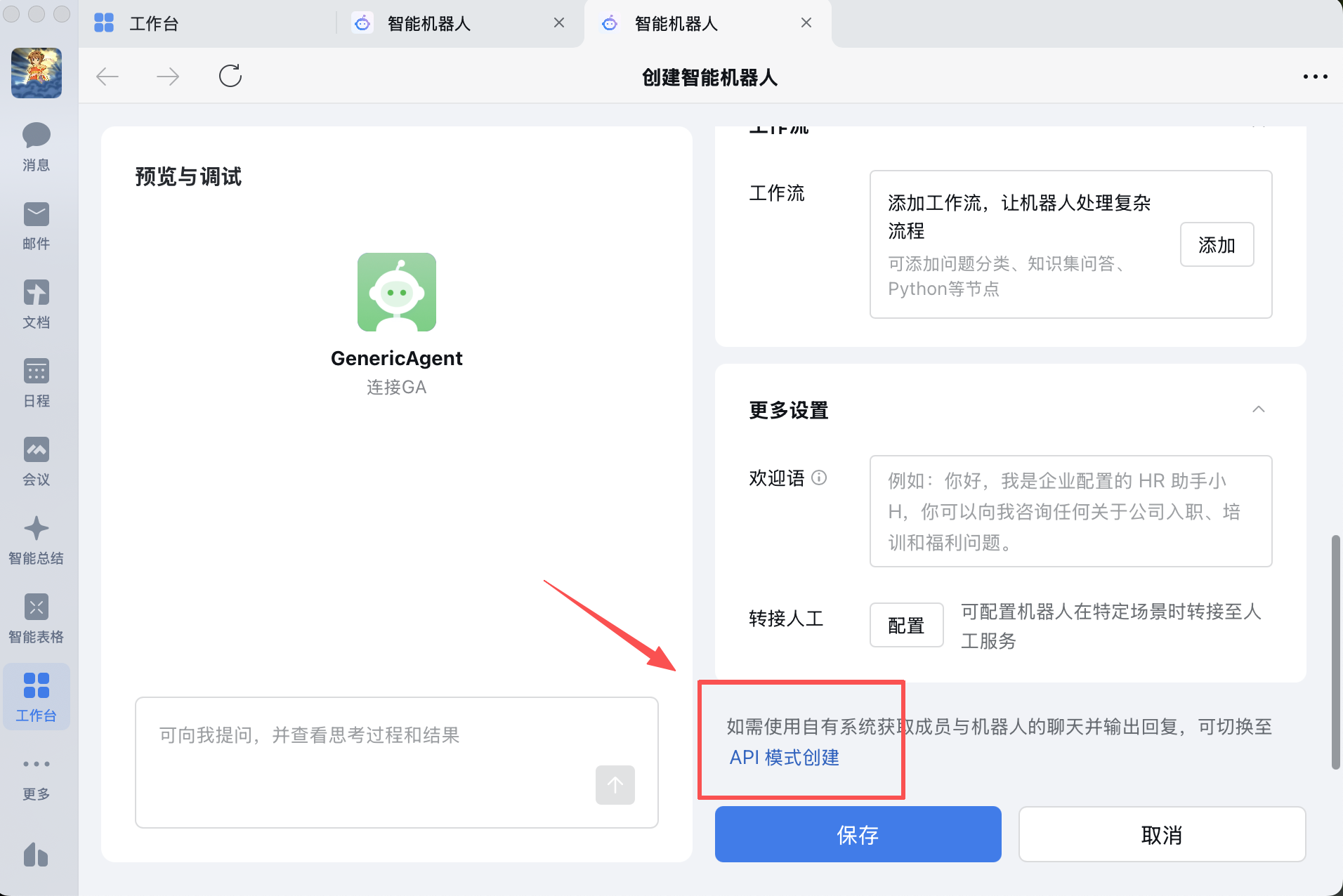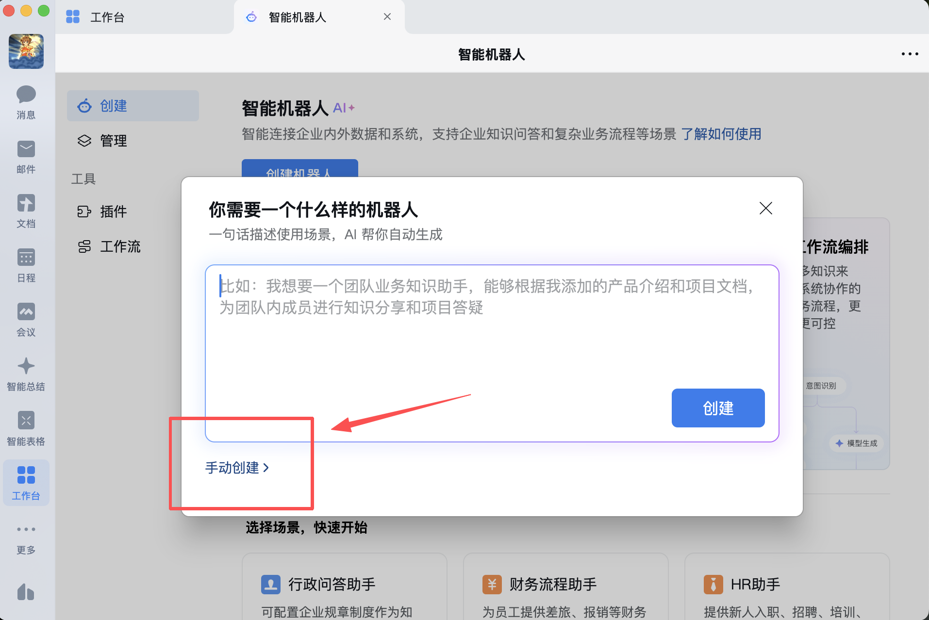 - 登录企业微信客户端,创建智能机器人