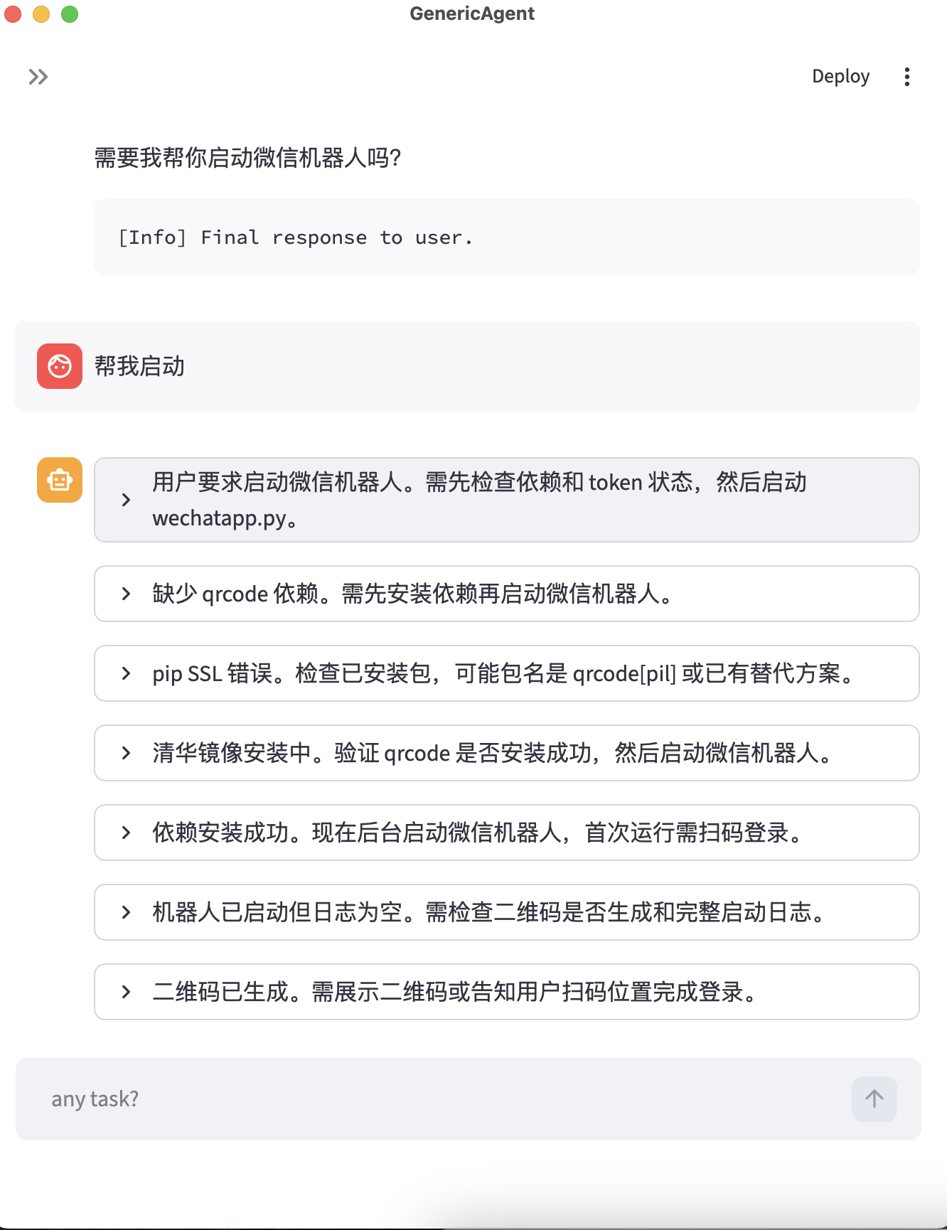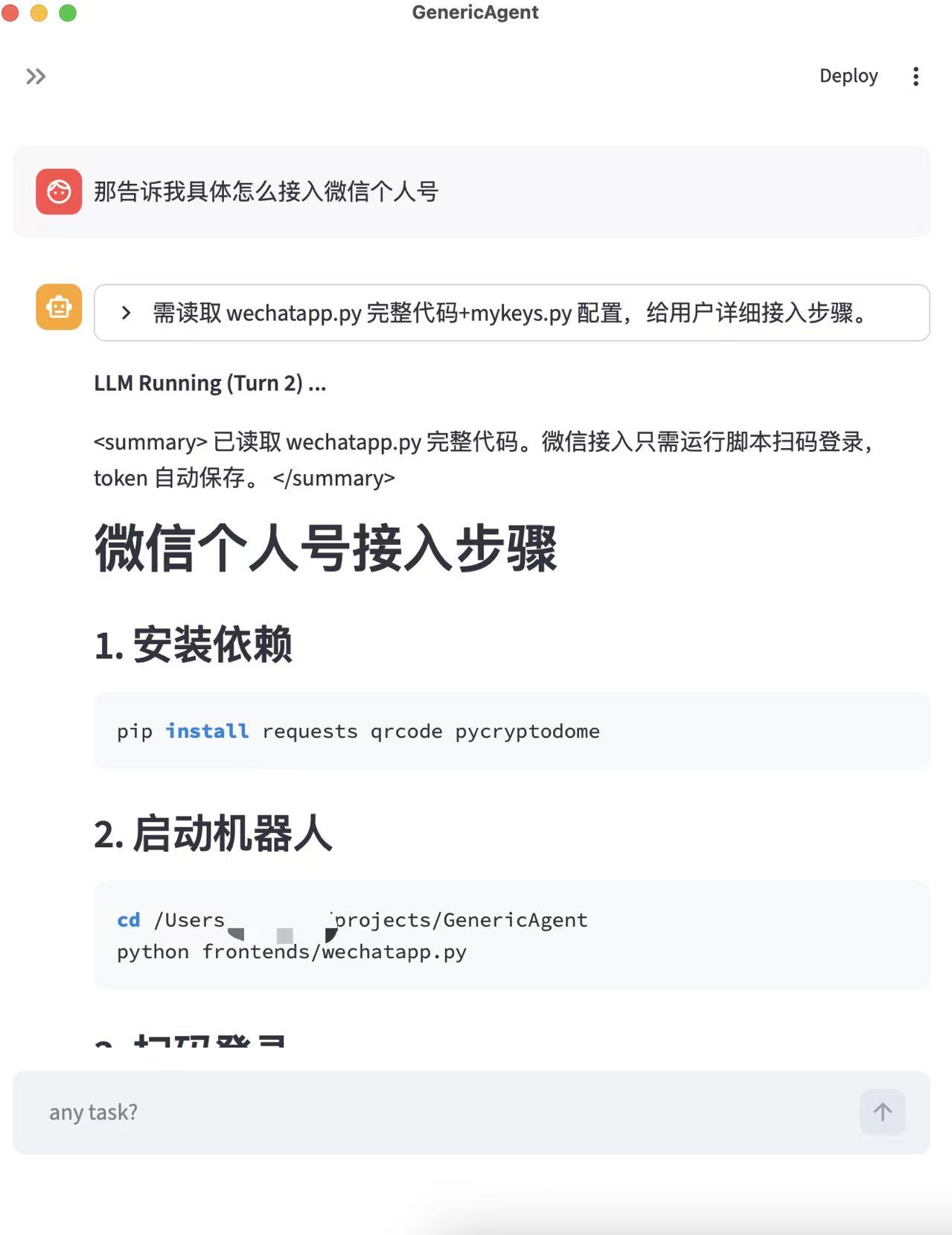 查看frontend/wechatapp.py,帮我接入微信 bot,最后记得生成一个二维码让我登录GA 会自动完成依赖安装和启动流程,你只需在最后扫码即可。
